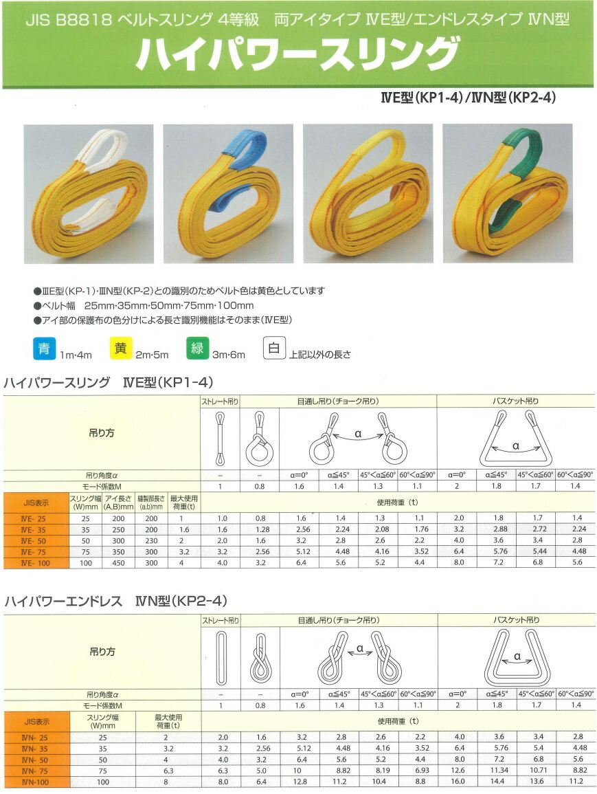 《仕様》●スリング幅:35mm●最大使用荷重:3.2t●全長:4m《特長》●IIIE型(KP-1)・IIIN型(KP-2)との識別のためベルト色は黄色としています。《仕様》●スリング幅:35mm●最大使用荷重:3.2t●全長:4m《特長》●IIIE型(KP-1)・IIIN型(KP-2)との識別のためベルト色は黄色としています。