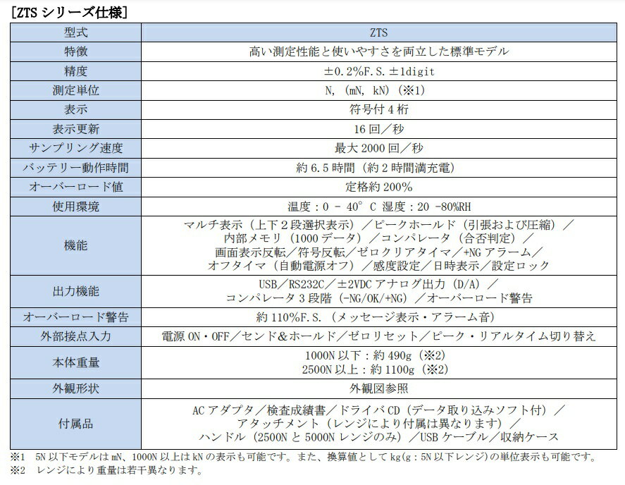 《仕様》●レンジ:1000N●表示:1000N(1.000kN)●最小分解能 :1N(0.001kN)●計測軸:M6 P1.0(並目) 有効 11.6mm●計測軸付属ナット:六角ナット(樹脂) 高さ5mm《特長》●高い測定性能と使いやすさを両立した標準モデルです。●ピーク値、連続データ共に高い再現性を実現する高速サンプリング。●明るく読みやすい有機ELの搭載と多彩な表示能力。●外部出力や豊富な機能で高まる測定の利便性。●付属のソフトウェアで、測定データおよび設定を簡単管理。《仕様》●レンジ:1000N●表示:1000N(1.000kN)●最小分解能 :1N(0.001kN)●計測軸:M6 P1.0(並目) 有効 11.6mm●計測軸付属ナット:六角ナット(樹脂) 高さ5mm《特長》●高い測定性能と使いやすさを両立した標準モデルです。●ピーク値、連続データ共に高い再現性を実現する高速サンプリング。●明るく読みやすい有機ELの搭載と多彩な表示能力。●外部出力や豊富な機能で高まる測定の利便性。●付属のソフトウェアで、測定データおよび設定を簡単管理。
