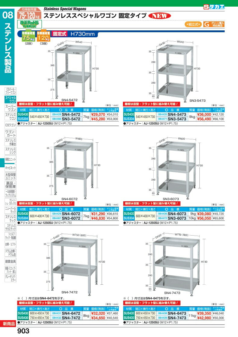 【組立式】 【組立費別途】 《商品説明》●「支柱突き合わせ方式」を採用した業界随一の堅牢性を誇るサカエのスペシャルワゴン!!棚板は皿型・フラット型に組み替え可能。●グリーン購入法適合商品《商品スペック》●外寸:W540×D450×H730mm●均等耐荷重:120kg●質量:9kg●材質:SUS304●アジャスター:ステンレス製 ネジ径M12 P×1.75●メーカー名:サカエオリジナルブランド●掲載カタログ:SAKAE2025総合カタログ903ページ《商品情報》●支柱突き合わせ方式●棚板は皿型・フラット型変更可能【配送料について】●大型商品の為、一部配達が出来ない地域や、別途送料が必要な場合がございます。※特に北海道のお客様はご注意下さい。●その場合は、ご注文後にメールで送料を含む合計金額をお知らせ致します。●送料が別途必要な場合は、ご注文後のキャンセルもお受け致します。お気軽にご注文下さいませ。●尚、送料が無料の場合は、そのまま出荷手配をさせて頂きます。【お支払い方法について】●こちらの商品はメーカーからの直送となります。代金引換のお支払い方法はご利用になれません。●代金引換にてご注文頂いた場合はご注文をキャンセルとさせて頂く場合がございますので予めご了承下さいませ。【組立式】 【組立費別途】 《商品説明》●「支柱突き合わせ方式」を採用した業界随一の堅牢性を誇るサカエのスペシャルワゴン!!棚板は皿型・フラット型に組み替え可能。●グリーン購入法適合商品《商品スペック》●外寸:W540×D450×H730mm●均等耐荷重:120kg●質量:9kg●材質:SUS304●アジャスター:ステンレス製 ネジ径M12 P×1.75●メーカー名:サカエオリジナルブランド●掲載カタログ:SAKAE2025総合カタログ903ページ《商品情報》●支柱突き合わせ方式●棚板は皿型・フラット型変更可能