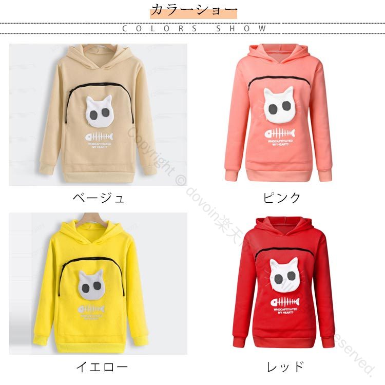 寒くなってきた季節に、愛犬・愛猫といっしょににあたたまるポケット付きパーカー。猫顔の窓口からニャンコの可愛い顔が出すとすぐ癒されます。裏ボア素材で暖かさ抜群。入れたまま移動出来るので抱っこ紐やスリング代わりとしても。猫ちゃんを入れたまま立ち上がることはもちろん出来ますし、ポケットが猫ちゃんの体を支えてくれるので、両手が自由!子猫から8kgまでの成猫に適応します。 サイズ S M L XL 2XL 3XL サイズについての説明 S バスト104cm ウェスト104cm 肩幅48cm 着丈63cmM バスト110cm ウェスト110cm 肩幅50cm 着丈67cm L バスト116cm ウェスト116cm 肩幅52cm 着丈70cm XL バスト121cm ウェスト121cm 肩幅54.5cm 着丈72cm2XL バスト125cm ウェスト125cm 肩幅56cm 着丈74cm3XL バスト130cm ウェスト130cm 肩幅58cm 着丈76cm 素材 ポリエステル 色 ベージュ ピンク イエロー レッド グレー ブラック ダークグレー ワインレッド 備考 ●サイズ詳細等の測り方はスタッフ間で統一、徹底はしておりますが、実寸は商品によって若干の誤差(1cm〜3cm )がある場合がございますので、予めご了承ください。 ●商品の色は、撮影時の光や、お客様のモニターの色具合などにより、実際の商品と異なる場合がございます。あらかじめ、ご了承ください。 ●製品によっては、生地の特性上、洗濯時に縮む場合がございますので洗濯時はご注意下さいませ。 ▼色味の強い製品によっては他の衣類などに色移りする場合もございますので、速やかに(脱水、乾燥等)するようにお願いいたします。 ▼生地によっては摩擦や汗、雨などで濡れた時は、他の製品に移染する恐れがございますので、着用の際はご注意下さい。 ▼生地の特性上、やや匂いが強く感じられるものもございます。数日のご使用や陰干しなどで気になる匂いはほとんど感じられなくなります。 指定された配送時間は承っておりません。【dovoin楽天市場店】
