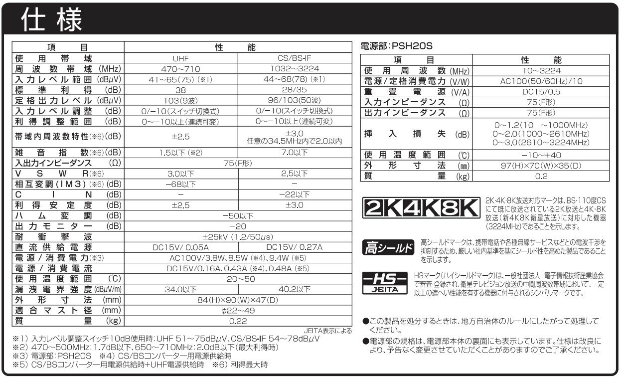 ご購入前に必ずメーカーホームページにて商品の詳細をご確認下さい。また、商品に関して何かご不明な点は下記までお問い合せ下さい。DXアンテナ カスタマーセンター(ナビダイヤル)0570-033-083(ナビダイヤルがご利用になれない場合)050-3818-9016※メーカーのサポート体制は予告無く変更・終了する場合がございます。新4K8K衛星放送(3224MHz)対応のCS/BS-IF、UHFを増幅するブースターです。種■テレビ信号が弱い場合や、複数のテレビにテレビ信号を送る必要がある場合に電波を強くするために使用します。 ■増幅帯域:UHF 38dB、BS/CS 28/35dB。 ■JEITA HSマーク認証済。 ■屋外用。 ◇ブースター本体部 ・外形寸法(mm):84(H)×90(W)×47(D) ・質量(kg):0.22 ◇電源部 ・電源/消費電力(V/W):AC100V(50/60Hz)/10 ・寸法(高さ×幅×奥行mm):97(H)×70(W)×35(D) ・質量(kg):0.2