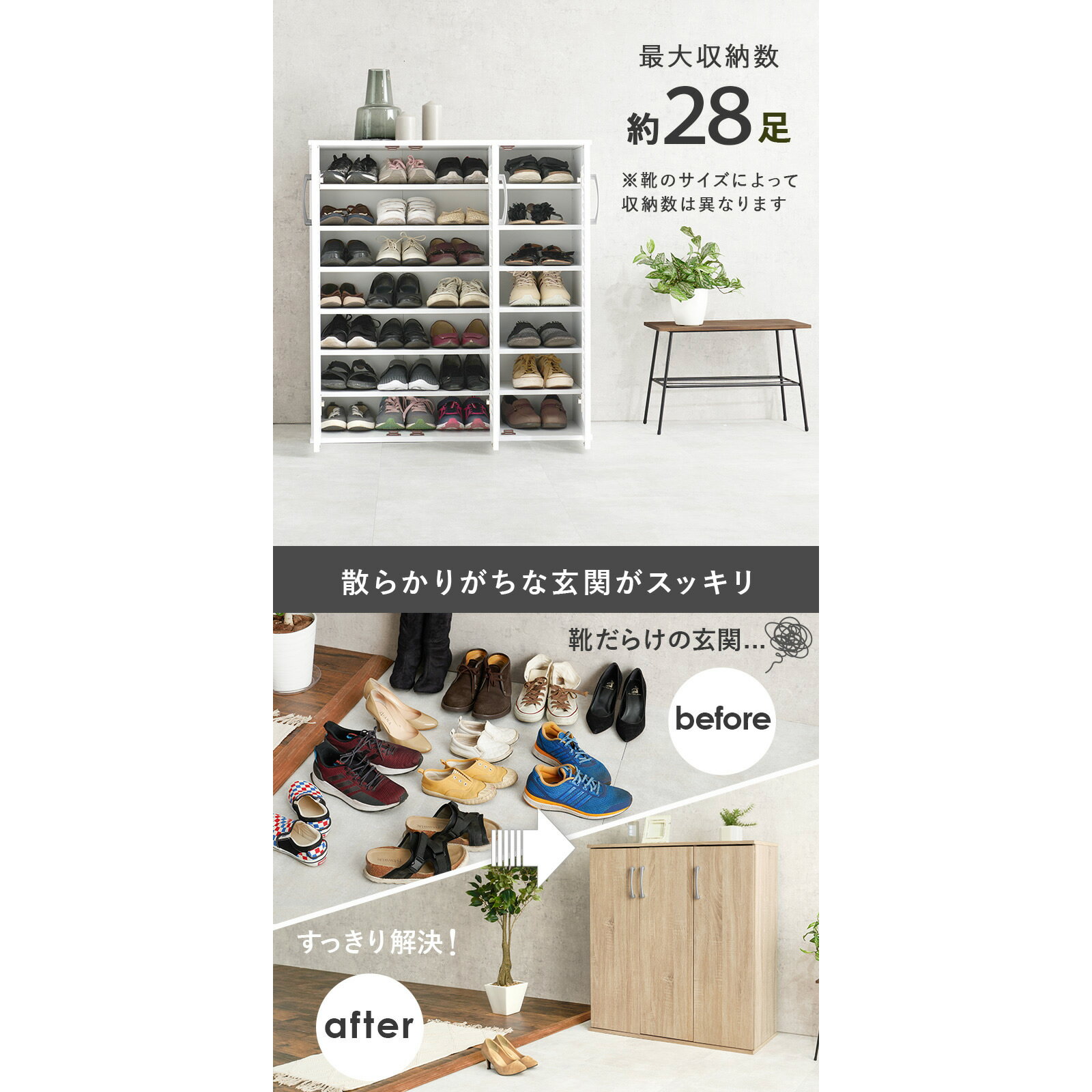 ご購入前に必ずにて商品の詳細をご確認下さい。また、商品に関して何かご不明な点は下記までお問い合せ下さい。萩原株式会社 スリーアイ本部086-523-4560※メーカーのサポート体制は予告無く変更・終了する場合がございます。※当商品は代金引換をご利用頂く事が出来ません。買い物かごのお支払方法にて代金引換をお選び頂かない様お願い申し上げます。 シンプルな見た目で玄関はもちろん室内にもなじみやすいシューズラック。傘や杖などの収納もでき玄関がスッキリ片付きます。■散らかりがちな玄関がスッキリ 最大収納数約28足。 ※靴のサイズによって収納数は異なります。 ■縦にも横にも2台連結できます 連結金具付きだから安心 ■高さ調節できる棚板 お好みの高さでご使用頂ける可動棚が10枚付属 ■リビング収納として 室内でも馴染むデザイン。本や小物などを扉の中に全部まとめて収納出来ます。 ■大き目サイズも高さのある靴も入ります。 棚板24cm。最下段31cm。 ■靴や杖まで入るんです 棚板と扉の間に隙間を設けているので長さのあるものも収納することが出来ます。 ◇サイズ:(約)幅89×奥行37×高さ95cm ◇素材:主材:プリント紙化粧パーティクルボード ◇組立式 ◇棚板:(大)6枚(小)6枚