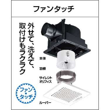 ご購入前に必ずにて商品の詳細をご確認下さい。また、商品に関して何かご不明な点は下記までお問い合せ下さい。パナソニック商品専用ご相談窓口(フリーダイヤル)0120-878-365(フリーダイヤルに接続できない場合)06-6907-1187※メーカーのサポート体制は予告無く変更・終了する場合がございます。湿気に強い樹脂製で、サニタリーを中心に広い用途に設置できます。シンプルなホワイト格子ルーバーの標準タイプ■高効率モーターで低消費電力 ■低騒音設計 ■羽根が簡単に外せてお掃除ラクラク ■風圧式高気密シャッター付 ■耐湿仕様 ■電源接続部−本体外部 ■浴室用/トイレ用/洗面所用/居室用/廊下用/ホール用/事務所用/店舗用 ◇本体:樹脂 ◇羽根:樹脂 ◇ルーバー:樹脂 ◇ルーバー寸法:240角×13mm ◇風量:95/95m2/h (50Hz/60Hz) ◇消費電力:7.6/9.3W (50Hz/60Hz) ◇電源電圧:単相100V ◇電源接続:速結端子 ◇適用パイプ径:φ100mm ◇埋込寸法:177mm角 ◇シャッター:風圧シャッター付 ※浴室など湿気の多い場所では水滴が落下する場合がありますが、換気扇の故障ではありません。取り付けに際しては不快にならない場所をお選びください。 ※温泉や殺菌用塩素を使用する公衆浴場等には取り付けないでください。故障の原因となります