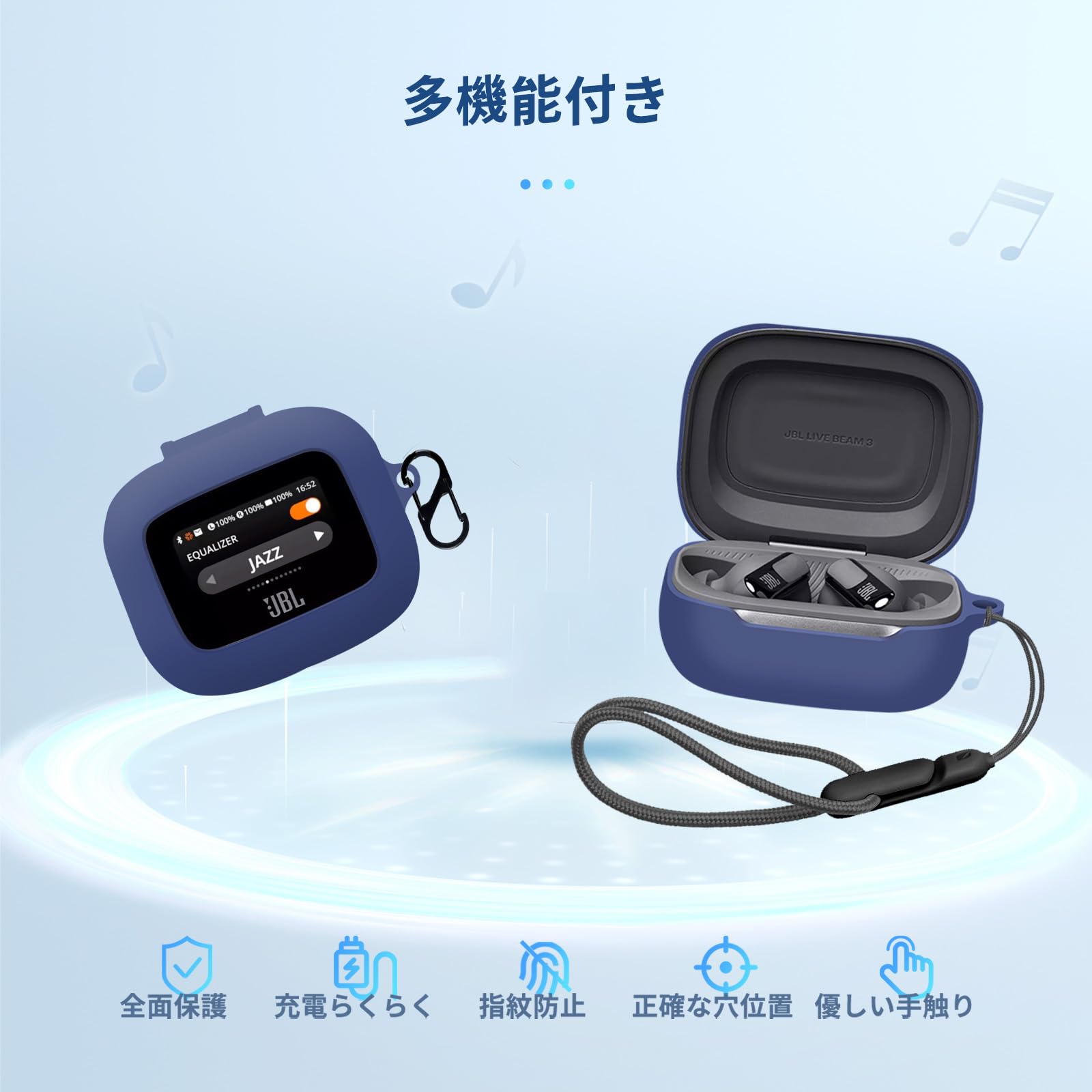 【送料無料】For JBL LIVE BEAM 3 用 ケース カバー +2枚フィルム【NOUKAJU】 ワイヤレス イヤーホン シリコン 保護ケース (カラビナ付き+ストラップ付き ) 落下防止 キズ防止 耐衝撃 装着充電可能 防水 防塵 (ブルー)