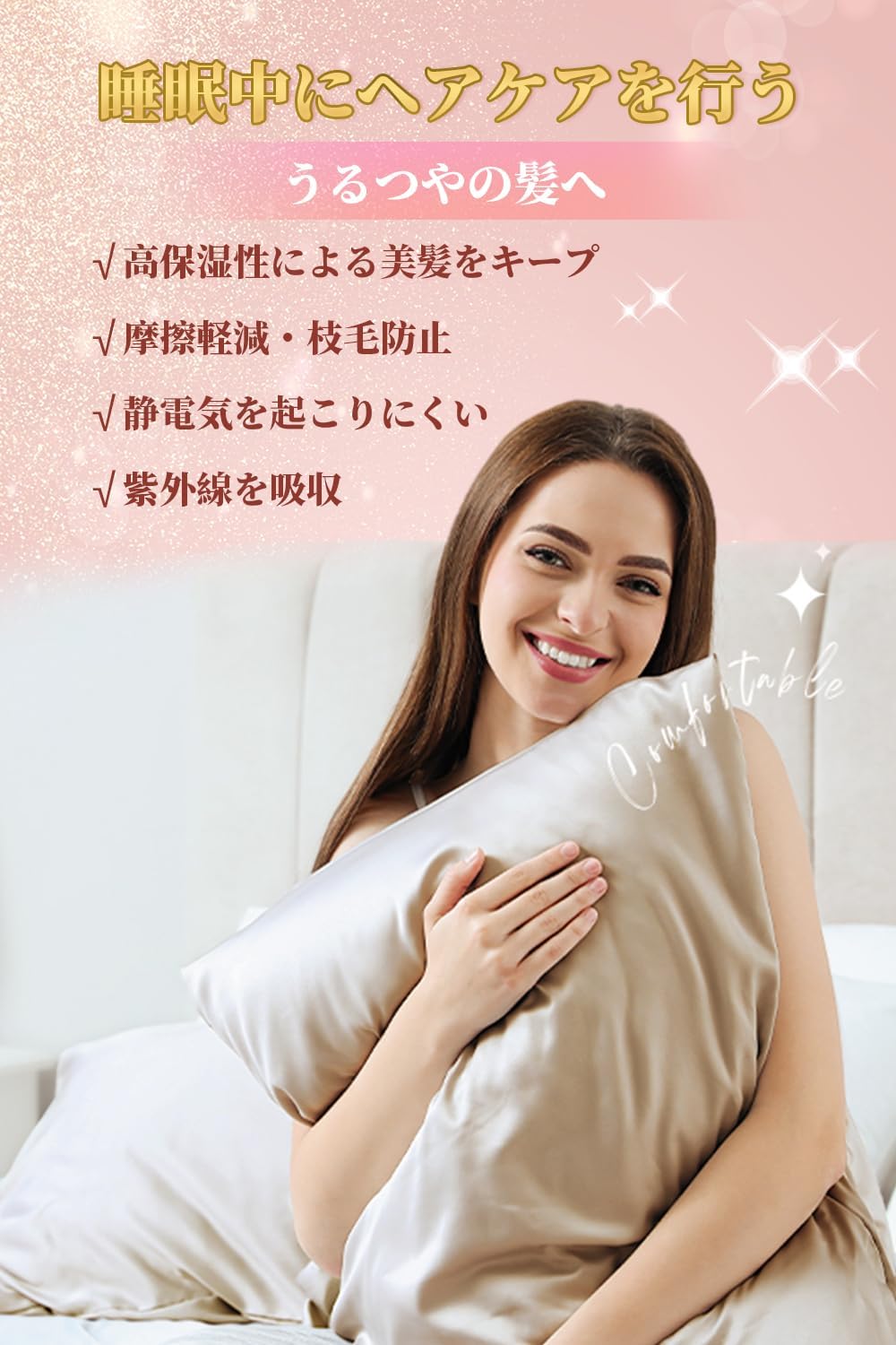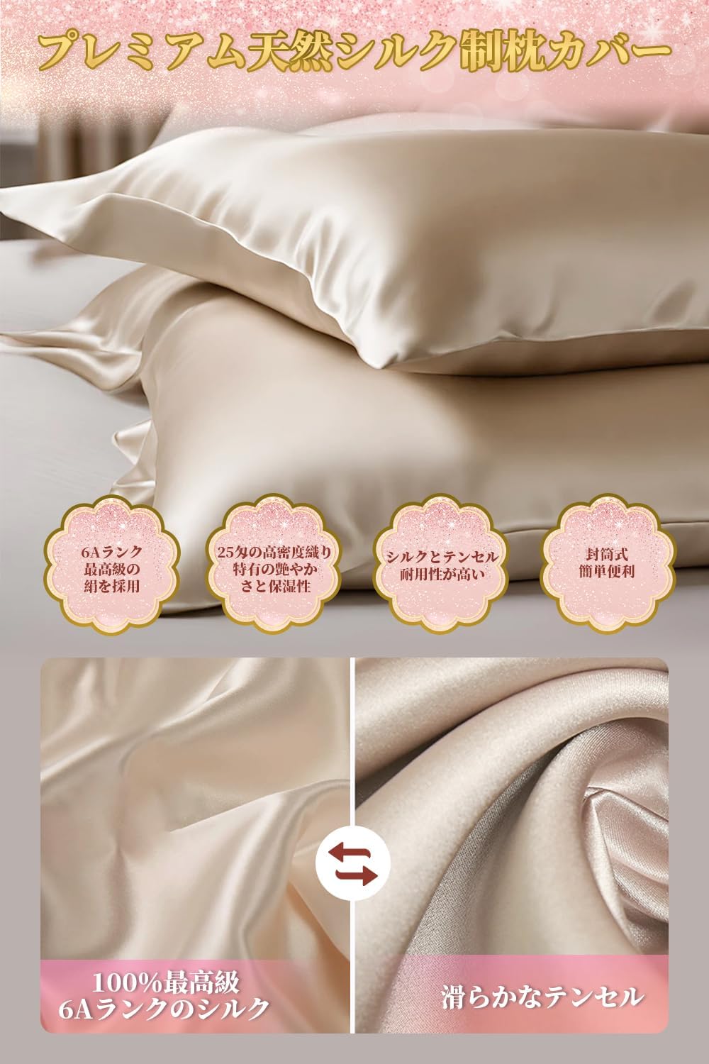 商品情報商品の説明主な仕様 【25匁天然シルク枕カバー】HEVUMYIのシルク枕カバーは表地に高品質の6Aランクの25匁マルベリーシルクを採用し、「サラッとや艶やかさ」のが特長のシルク枕カバーは一層ラグジュアリー感にこだわり、高級感を演出するシャンパンカラーに仕上げました。HEVUMYIはシルク産地から素材を厳選して、第三者機関にてCANS認証も承認済です。髪にも肌の敏感なアレルギー体質にも良くアトピーの方にも適されるとのことで健康的ピローケースです。