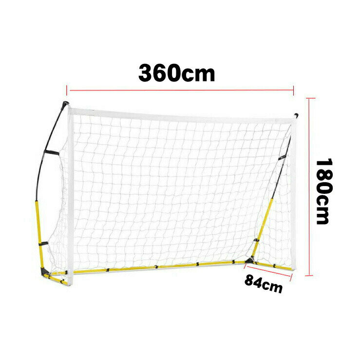 【1台売り】簡単に組み立てを考慮した、サッカーゴール。サッカーのみならずフットサルにも利用可能。収納時サイズ:幅28×奥行95cm。本体は幅W3.6m*H1.8m*D84mm 重量6.15kg。専用のフットサル場などを借りずとも、体育館や運動場などゴールの無い場所でもフットサルが楽しめます。ネットを強く張り上げるサイドポール部分にはしなりに強く、釣竿などの素材としても使用されるファイバーグラスを採用。軽量ながら幅広い世代のシュートに耐えうる構造となっています。キャリーバッグ付で持ち運びも可能。組立て方法は非常に簡単ですが、特殊なフレーム形状によりネット取付前はフレームが扇形のような状態に広がります。正常な状態ですので、ご安心ください。【商品特徴】・全天候型UPVC製ポールと錆びにくいフレームで屋外常設使用が可能・より試合に近い使用感・長いゴールバーが垂れ下がりにくい特許取得の特殊構造・少年サッカー8人制サイズなので、練習試合などにも対応可能・僅か数十秒でフラットに変形できる折りたたみ構造・ポールは予め連結されており、説明不要の簡単組立・持ち運び用キャリーバッグ付き・こんなシーンにおすすめ8人制サッカー クラブ活動及び部活動 ゴールの無いグラウンドでの練習 体育館での練習 練習試合 ミニゲーム等対象年齢:小学生〜大人まで(小さなお子様のご使用時は保護者の方が同伴ください)…※輸入品の為、多少の小傷、サビ等がある場合が御座います。※製品のカラー等は、モニターの環境により異なります。※予告なく仕様変更の場合がございます。よく一緒に購入されている商品サッカー ゴール 組み立て 折りたたみ ミニゴール フットサル 練習 ネット