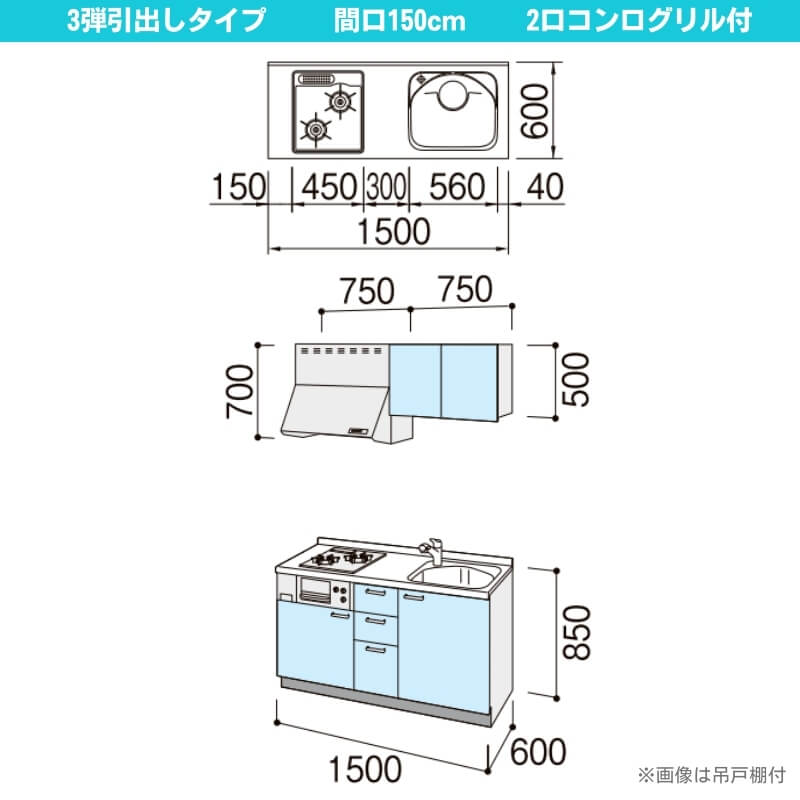【11月はエントリーでP10倍】 コンパクトキッチン ティオ Tio LixiL 壁付I型 3段引出し W1500mm 間口150cm(グリル付き2口コンロ用) グループ1 リクシル システムキッチン フロアユニットのみ ドリーム