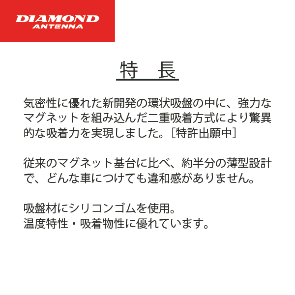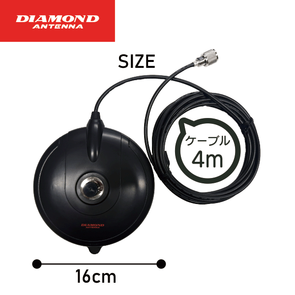 ■160mm ●同軸ケーブル:RG58A/U・4m ●接栓:MJ-MP ●指定アンテナ:全長1.5m以下・重量350g以下 (特許出願済み)) マグネット基台は、磁石の力で車に固定する簡易的なアンテナ基台です。 脱落による事故を防ぐために指定された”ステンレス製ホイップアンテナ” 以外は取り付けないで下さい。 その他の注意事項はメーカーサイト内の共通取説PDFにてご確認をお願い致します。