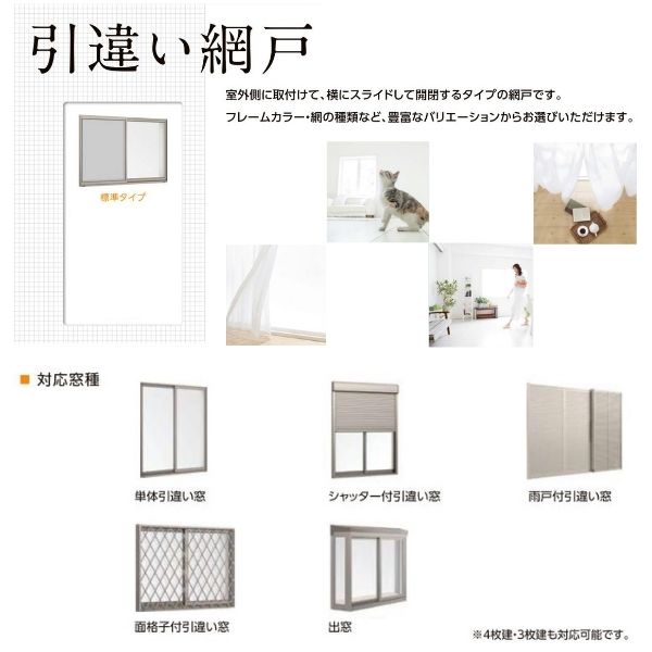 ご注文の前に必ずお読みください。 相談・お問合わせ先 ☆商品に関するご相談・お問合わせ☆LIXIL/TOSTEM お客さま相談センター TEL. 0120-126-001 FAX. 03-3638-8447 受付時間 月〜金 9:00〜18:00 土日祝日 9:00〜17:00 ※ゴールデンウィーク/夏季休暇/年末年始を除く ★ご注文に関する相談・お問合わせ★ リフォームおたすけDIY メール. info@dreamotasuke.co.jp FAX. 0799-64-1111 ※土日祝/ゴールデンウィーク/夏季休暇/年末年始を除く リフォーム網戸取り付け条件 1.網戸レールの芯からガラス障子のフレーム面までの間隔が8〜12mm以内 2.上レールのふところ(深さ)が12mm以上必要 3.網戸上下レールが垂直線上にある Wサイズは既存のガラス障子巾(網戸出来上がりW寸法) Hサイズは網戸を取り付ける上下レールの先端同士(レールの底ではありません) ※網戸出来寸法Hサイズは弊社でレール内々H寸法にレールにかませる分+11mmしてお手配致します。 お客様からは実測寸法をお知らせください。 仕様・性能 商品説明内の資料参照標準タイプの採寸H≧1620mmは中桟付きになります。標準タイプ・太框タイプとも採寸H≦588mmは中桟無になります。ステンレスネットはもらい錆を生じる場合があります。既設サッシがLIXIL製品以外の場合は、フレームカラーは同一色になりません。 商品に関する事項 商品画像はイメージです。実物と異なる場合がありますのでご注意ください。 お支払方法 銀行、郵便局、クレジットなど オプション選択項目の増減金額、送料の変更等は自動計算、自動送信メールには反映されません。 受注承諾メールを必ずお送りしておりますので、必ずそちらで確定金額をご確認ください。 納期、在庫に関する事項 納期は仕様により異なりますのでお急ぎの場合はお問合わせください 納期を確認後、出荷予定日をメールにてご連絡します。 配送に関する事項 北海道、沖縄を含む離島、遠隔地は送料が別途必要となる場合があります。 配送には保険を適用しております。保険適用条件内のお届けから3日以内に開梱の上、検品をお願いいたします。 お届け状態に関する事項 完成品でのお届けとなります。 その他注意事項 確定金額は注文承諾メールにてお知らせいたしますので、必ずご確認ください。 オプション選択項目の増減金額、送料等は自動計算自動返信メールには反映されませんのでご注意ください。 当商品はお客様からのご注文後にメーカー発注しております。 メーカー手配後の商品の変更、キャンセルはできませんのでご注意ください。 ※メーカー手配前(注文確定前)の変更、キャンセルは可能です。 ※お届け時の商品間違い、商品破損については商品代替えのみの対応となり、いかなる原因だとしても二次的な被害の保証は一切承っておりませんのでご理解の上でのご購入をお願いします。 また、不具合商品を一度取付されますと、取付時の不具合とみなされますので絶対に不具合品の取付は行わないでください。当店ではLIXILの純正網戸をお安いお値打ち価格を心掛けて販売しております。 屋外側に取り付けて横にスライドして開閉するタイプの網戸です。 フレームカラー・網の種類など、豊富なバリエーションからお選びいただけます。