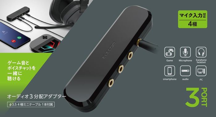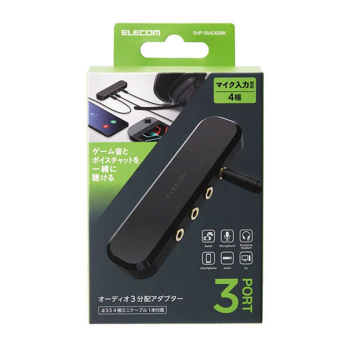 SEARCH WORD:アダプタ あだぷた アダプター あだぷたー オーディオアダプタ おーでぃおあだぷた オーディオアダプター おーでぃおあだぷたー 分配アダプター ぶんぱいあだぷたー オーディオ分配アダプター おーでぃおぶんぱいあだぷたー オーディオ出力3分配 4極ミニケーブル付属 同時視聴・同時通話可能 黒 ブラック black商品概要:1台の端末の音楽を3人同時に楽しむことや、複数の端末の音楽をミックスすることができます。4極対応コネクタのため、3人同時に通話をすることができます。各ケーブルを同じ方向に配線できるデザインなので、すっきり配線できます。サビや信号劣化の心配がない金メッキピンを使用しています。スマートフォンやゲーム機などの端末との接続用4極3.5φミニプラグケーブルを付属しています。対応確認済みのイヤフォン及びヘッドフォン型番:EHP-CS3520MBK、HS-EP15TBK、EHP-MC3520BK、EHP-CN300MWH、EHP-CS3520MWH ※ご利用のイヤフォン、ヘッドフォンの組み合わせによっては、ノイズが発生する可能性があります。※イヤフォンジャックを搭載しないスマートフォンをご使用の場合、別売の3.5φ音声変換ケーブルが必要です。商品仕様:■メーカー:エレコム■JANコード:4549550242523■商品名:オーディオ分配アダプター オーディオ出力3分配 4極ミニケーブル付属 同時視聴・同時通話可能 オーディオアダプター 分配アダプター ブラック■型番:EHP-35AD03BK■対応機種:3.5φミニプラグを搭載したヘッドフォン・イヤフォン及び、3.5φミニプラグを搭載したスマートフォン・ゲーム機等■インターフェイス:3.5φ4極ミニジャック×4 ※どのジャックでも音声入力及び出力端子としてご利用いただけます。■プラグメッキ仕様:金メッキ■ケーブル長:約0.5m (付属ケーブル)※コネクター含まず■ケーブル太さ:2.6mm■カラー:ブラック■ご注意事項:※こちらの商品はお客様のご都合によるご返品、交換等はご遠慮いただいております。※商品の仕様、および外観、パッケージ等は予告なく変更される場合がございます。※画像はイメージです。コーディネイトなどに使用している商品は含まれません。※本商品は代金引換払いでのお支払いは承れません。※商品概要、仕様、サービス内容及び企業情報などは商品発表時点のものです。※最新の情報に関しましては、メーカーサイトをご覧ください。※発売前予約商品についてはメーカーの商品製造数により納期が遅れる場合やご注文キャンセルをお願いする場合がございます。