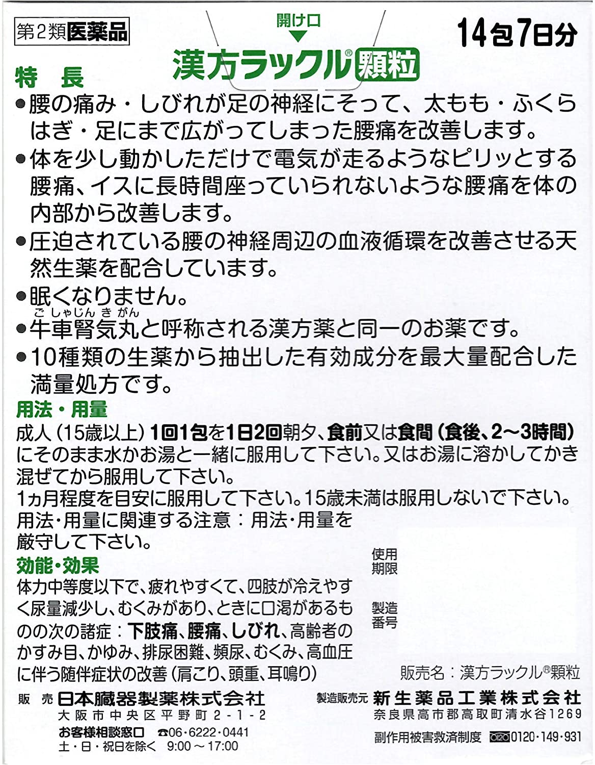 【内容量】 14包 【商品説明】 ●腰の痛み・しびれが足の神経にそって、太もも・ふくらはぎ・足にまで広がってしまった腰痛を改善します。 ●体を少し動かしただけで電気が走るようなピリッとする腰痛、イスに長時間座っていられないような腰痛を体の内部から改善します。 ●圧迫されている腰の神経周辺の血液循環を改善させる天然生薬を配合しています。 ●眠くなりません。 ●牛車腎気丸(ごしゃじんきがん)と称呼される漢方薬と同一のお薬です。 ●10種類の生薬から抽出した有効成分を最大量配合した満量処方です。 【効能 効果】 体力中程度以下で、疲れやすくて、四肢が冷えやすく尿量減少し、むくみがあり、ときに口渇があるものの次の諸症:下肢痛、腰痛、しびれ、高齢者のかすみ目、かゆみ、排尿困難、頻尿、むくみ、高血圧に伴う随伴症状の改善(肩こり、頭痛、耳鳴り) 【用法 用量】 ・成人(15歳以上)1回1包を1日2回朝夕、食前又は食後(食後、2〜3時間)にそのまま水かお湯と一緒に服用して下さい。又はお湯に溶かしてかき混ぜてから服用して下さい。 ・1ヵ月程度を目安に服用して下さい。 ・15歳未満は服用しないで下さい。 (用法・用量に関連する注意) ・用法・用量を厳守して下さい。 【成分】 1日量2包 5.4g中 牛車腎気丸乾燥エキス:4.8g ボタンピ・・・3.0g、ジオウ・・・5.0g、ゴシツ・・・・3.0g、サンシュユ・・3.0g、サンヤク・・3.0g、シャゼンシ・・3.0g、タクシャ・・・3.0g、ブクリョウ・・・3.0g、ケイヒ・・・1.0g、ブシ末・・・・1.0g 生薬から抽出した有効成分4.8gを全て配合した満量処方と呼ばれる成分量です。 添加物:ヒドロキシプロピルセルロース、アセスルファムカリウム、乳糖水和物、ステアリン酸マグネシウム ■剤型:顆粒 【注意事項】 ●使用上の注意 ・相談すること 1.次の人は服用前に医師、薬剤師又は登録販売者に相談して下さい。 (1)医師の治療を受けている人。 (2)妊婦又は妊娠していると思われる人。 (3)胃腸が弱く下痢しやすい人。 (4)のぼせが強く赤ら顔で体力の充実している人。 (5)今までに薬などにより発疹・発赤、かゆみ等を起こしたことがある人。 2.服用後、次の症状があらわれた場合は副作用の可能性があるので、直ちに服用を中止し、製品の箱を持って医師、薬剤師又は登録販売者に相談して下さい。 (関係部位・・・症状) 皮ふ・・・発疹・発赤、かゆみ 消化器・・・食欲不振、胃部不快感、腹痛 その他・・・動悸、のぼせ、口唇・舌のしびれ まれに下記の重篤な症状が起こることがあります。その場合は直ちに医師の診療を受けて下さい。 (症状の名称・・・症状) 間質性肺炎・・・階段を上ったり、少し無理をしたりすると息切れがする・息苦しくなる、空せき、発熱等がみられ、これらが急にあらわれたり、持続したりする。 肝機能障害・・・発熱、かゆみ、発疹、黄疸(皮ふや白目が黄色くなる)、褐色尿、全身のだるさ、食欲不振等があらわれる。 3.服用後、下痢があらわれることがあるので、下痢の持続又は増強が見られた場合には、服用を中止し、製品の箱を持って医師、薬剤師又は登録販売者に相談して下さい。 4.1ヵ月服用しても症状がよくならない場合は服用を中止し、製品の箱を持って医師、薬剤師又は登録販売者に相談して下さい。 ●保管及び取扱い上の注意 (1)直射日光の当たらない湿気の少ない涼しい所に保管して下さい。 (2)小児の手の届かない所に保管して下さい。 (3)他の容器に入れ替えないで下さい。誤用の原因になったり品質が変わることがあります。 (4)使用期限を過ぎた製品は服用しないで下さい。 【お問い合わせ先】 こちらの商品につきましての質問や相談は、 当店(ドラッグピュア)または下記へお願いします。 日本臓器製薬株式会社 お客様相談室 541-0046 大阪市中央区平野町2丁目1番2号 電話:06-6222-0441 広告文責:株式会社ドラッグピュア 作成:201808ok 神戸市北区鈴蘭台北町1丁目1-11-103 TEL:0120-093-849 製造販売:日本臓器製薬株式会社 区分:第2類医薬品・日本製 文責:登録販売者 松田誠司 使用期限:使用期限終了まで100日以上 ■ 関連商品 日本臓器製薬 お取扱商品