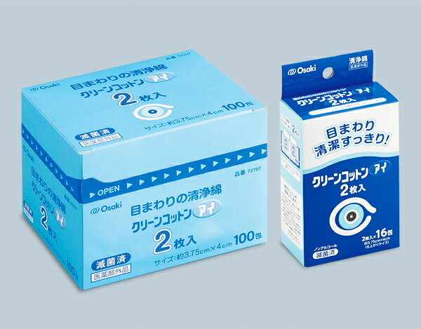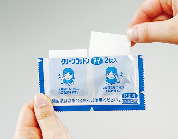 『クリーンコットンアイ 2枚×100包』【医薬部外品】JANコード:4971032727073★眼科用拭き綿として便利な、単包滅菌済清浄綿■商品説明 ・眼科用拭き綿として便利な、単包滅菌済清浄綿です。 ・4方どこからでも開封することができる個包装です。 また、脱脂綿を清潔に取り出すことができる位置が強調されています。 ・2枚入のため、1枚ずつ左右両方の目を拭くことができます。 ・アルミ個包装が水分の蒸発を防ぎ、常に清潔な状態で使用できます。 ・アルコール・香料は使用していません。 ・16包は色のコントラストを出したパッケージで、 白内障や弱視の方でも購入時にわかりやすいユニバーサルデザインです。 また、視覚障害のある方に配慮した点字表記をパッケージ天面にしています。 ・100包入はミシン目より箱の上部を取り外すことができるため、 簡単に取り出すことができます。 ■使用上の注意 ・赤み、はれ、かゆみ等の症状が見られることがあるため、 このような症状が現れた場合はすみやかに使用を中止し、医師または薬剤師にご相談下さい。 ・1枚で左右両方の目まわりを拭きますと、眼病がうつる恐れがありますので避けてください。 ・目の中を拭かないでください。 ・かぶれたり刺激を感じた場合は使用を中止してください。 ・滅菌品のため、開封後はなるべく早くご使用下さい。 ・本品は使いきりです。くり返しの使用はおやめ下さい。 ・手洗い等をして清潔な手でご使用下さい。 ※ご注意 ・ 綿の表面あるいは内部に、黄色又は黒色の斑点状のものが見つかることがありますが、これは綿の実殻です。 使用上の心配はありません。 ・ 開封時、まれにアルミフィルム特有のにおいがする場合がありますが、品質には問題ありません。 ・ 水分が多いと感じた場合には、軽く絞ってご使用下さい。 ■保管上の注意 ・高温や直射日光の当たる場所はさけ、お子様の手の届かない所に保管してください。 ■使用後の注意 ・ご使用後、トイレには流さないで衛生的に処理してください。 ◆脱脂綿 3.75cm×4cm 2ツ折 2枚入(100包)■成分:一般医療機器医療脱脂綿にクロルヘキシジングルコン酸塩0.02%水溶液含有■日本製【お問い合わせ先】当店(ドラッグピュア)または下記へお願い申し上げます。オオサキメディカル株式会社TEL:0120-15-0039受付時間 10:00〜17:00 ※土・日、祝祭日を除く広告文責:株式会社ドラッグピュア作成:201306KY神戸市北区鈴蘭台北町1丁目1-11-103TEL:0120-093-849区分:医薬部外品・日本製■ 関連商品オオサキメディカル株式会社 取り扱い商品清浄綿 関連商品