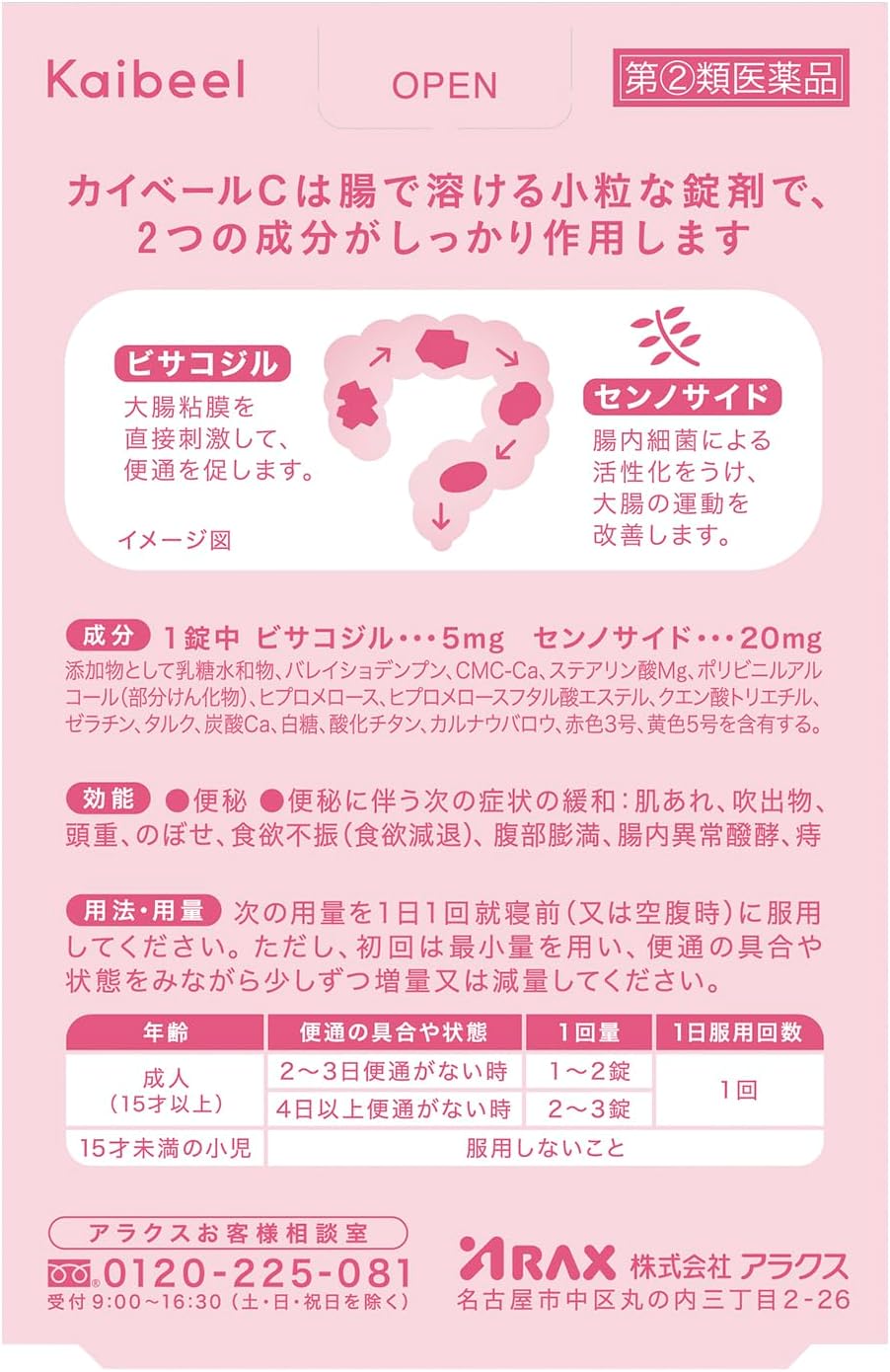 ■製品特徴○ビサコジルとセンノサイド、2つの有効成分を最大量配合※しています。※承認基準内で最大量配合(3錠中)承認基準とは、厚生労働省が承認事務の効率化を図るために定めた医薬品の範囲のこと。○症状に合わせて、服用量を調節できます。○ピンク色をした、のみやすい小粒な糖衣錠です。○腸溶性コーティングが施してあるため、2つの有効成分が大腸に直接作用します。○はじめての方はまず1錠から服用してください。■内容量144錠■効能・効果1)便秘2)便秘に伴う次の症状の緩和:肌あれ、吹出物、頭重、のぼせ、 食欲不振(食欲減退)、腹部膨満、腸内異常醗酵、痔■用法・用量大人(15才以上)2〜3日便通がない時 1〜2錠4日以上便通がない時 2〜3錠1日1回就寝前(又は空腹時)に服用してください。ただし、初回は最小量を用い、便通の具合や状態をみながら少しずつ増量又は減量してください。■成分・分量1錠中ビサコジル 5mgセンノサイド 20mg■使用上の注意●してはいけないこと1.本剤を服用している間は、次の医薬品を服用しないでください他の瀉下薬(下剤)2.授乳中の人は本剤を服用しないか、本剤を服用する場合は授乳を避けてください3.大量に服用しないでください●相談すること1.次の人は服用前に医師、薬剤師又は登録販売者に相談してください(1)医師の治療を受けている人。(2)妊婦又は妊娠していると思われる人。(3)薬などによりアレルギー症状を起こしたことがある人。(4)次の症状のある人。はげしい腹痛、吐き気・嘔吐2.服用後、次の症状があらわれた場合は副作用の可能性があるので、直ちに服用を中止し、この文書を持って医師、薬剤師又は登録販売者に相談してください関係部位・・・症状皮膚・・・発疹・発赤、かゆみ消化器・・・はげしい腹痛、吐き気・嘔吐3.服用後、次の症状があらわれることがあるので、このような症状の持続又は増強が見られた場合には、服用を中止し、この文書を持って医師、薬剤師又は登録販売者に相談してください下痢4.1週間位服用しても症状がよくならない場合は服用を中止し、この文書を持って医師、薬剤師又は登録販売者に相談してください■保管及び取扱い上の注意(1)直射日光の当たらない湿気の少ない涼しい所に保管してください。(2)小児の手の届かない所に保管してください。(3)他の容器に入れ替えないでください(誤用の原因になったり品質が変わります。)。(4)使用期限をすぎた製品は服用しないでください。【お問い合わせ先】こちらの商品につきましての質問や相談は、当店(ドラッグピュア)または下記へお願いします。株式会社アラクス〒460-0002 愛知県名古屋市中区丸の内3丁目2-26電話:0120-225-081受付時間:9:00〜16:30(土・日・祝日を除く)広告文責:株式会社ドラッグピュア作成:202506AY神戸市北区鈴蘭台北町1丁目1-11-103TEL:0120-093-849製造販売:株式会社アラクス区分:【第(2)類医薬品】文責:登録販売者 松田誠司■ 関連商品便秘薬関連商品株式会社アラクスお取り扱い商品■ 医薬品をご注文いただく前にご確認ください ■第2類・指定第2類と表示されている医薬品につきましては安全にご使用頂きます為に、予めご購入制限数を設定しております。医薬品ご注文前は、買い物かご上にある項目をチェックし当てはまるものを必ずご選択ください。商品に関するご相談は、登録販売者がお受付けいたします。ご質問やご不明な点がございましたら、弊社お問い合わせ窓口までご相談ください。(フリーダイヤル:0120-093-849 受付時間:8:00~20:00)