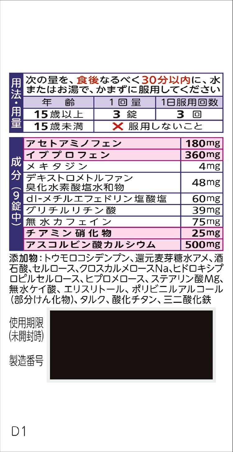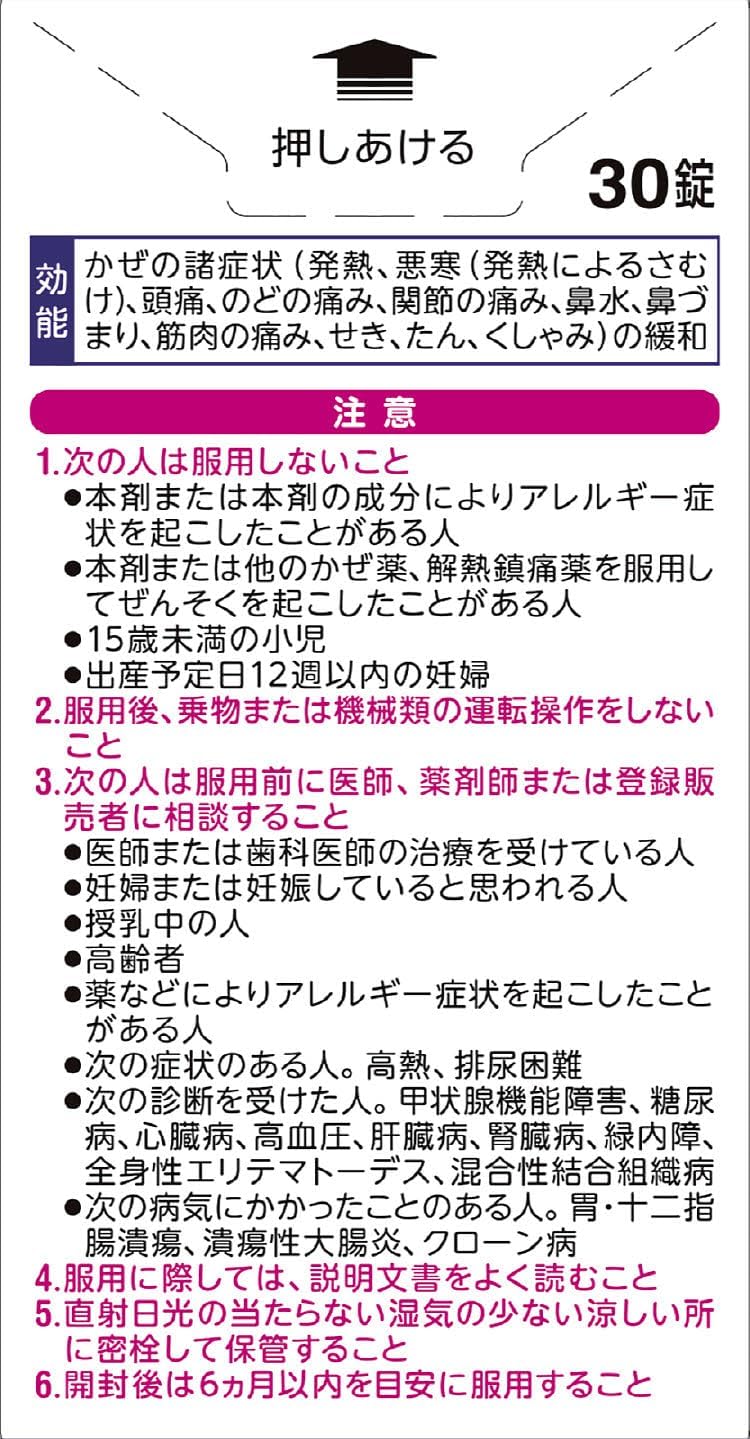 商品説明 ●イブプロフェンとアセトアミノフェンの2種の解熱鎮痛成分がはたらき、のどの痛みをおさえ、熱を下げます。 ●チアミン硝化物が、かぜによって消耗した体力の回復を促します。 ●アスコルビン酸カルシウムが、かぜの時に消耗しやすいビタミンCを補給します。 ●9種の成分を配合し、かぜのいろいろな症状を緩和します。 ●のみやすい小型の淡黄褐色の円形の錠剤です。 使用上の注意 してはいけないこと (守らないと現在の症状が悪化したり、副作用・事故が起こりやすくなる) 1.次の人は服用しないこと (1)本剤または本剤の成分によりアレルギー症状を起こしたことがある人。 (2)本剤または他のかぜ薬、解熱鎮痛薬を服用してぜんそくを起こしたことがある人。 (3)15歳未満の小児。 (4)出産予定日12週以内の妊婦。 2.本剤を服用している間は、次のいずれの医薬品も使用しないこと 他のかぜ薬、解熱鎮痛薬、鎮静薬、鎮咳去痰薬、抗ヒスタミン剤を含有する内服薬等(鼻炎用内服薬、乗物酔い薬、アレルギー用薬、催眠鎮静薬等) 3.服用後、乗物または機械類の運転操作をしないこと (眠気等があらわれることがある。) 4.服用前後は飲酒しないこと 5.5日間を超えて服用しないこと 相談すること 1.次の人は服用前に医師、薬剤師または登録販売者に相談すること (1)医師または歯科医師の治療を受けている人。 (2)妊婦または妊娠していると思われる人。 (3)授乳中の人。 (4)高齢者。 (5)薬などによりアレルギー症状を起こしたことがある人。 (6)次の症状のある人。高熱、排尿困難 (7)次の診断を受けた人。甲状腺機能障害、糖尿病、心臓病、高血圧、肝臓病、腎臓病、緑内障、全身性エリテマトーデス、混合性結合組織病 (8)次の病気にかかったことのある人。胃・十二指腸潰瘍、潰瘍性大腸炎、クローン病 2.服用後、次の症状があらわれた場合は副作用の可能性があるので、直ちに服用を中止し、この文書を持って医師、薬剤師または登録販売者に相談すること 関係部位・・・症状 皮膚・・・発疹・発赤、かゆみ、青あざができる 消化器・・・吐き気・嘔吐、食欲不振、胃部不快感、胃痛、口内炎、胸やけ、胃もたれ、胃腸出血、腹痛、下痢、血便 精神神経系・・・めまい 循環器・・・動悸 呼吸器・・・息切れ、息苦しさ 泌尿器・・・排尿困難 その他・・・目のかすみ、耳なり、むくみ、鼻血、歯ぐきの出血、出血が止まりにくい、出血、背中の痛み、過度の体温低下、からだがだるい まれに下記の重篤な症状が起こることがある。その場合は直ちに医師の診療を受けること。 症状の名称・・・症状 ショック(アナフィラキシー)・・・服用後すぐに、皮膚のかゆみ、じんましん、声のかすれ、くしゃみ、のどのかゆみ、息苦しさ、動悸、意識の混濁等があらわれる。 皮膚粘膜眼症候群(スティーブンス・ジョンソン症候群)、中毒性表皮壊死融解症、急性汎発性発疹性膿疱症・・・高熱、目の充血、目やに、唇のただれ、のどの痛み、皮膚の広範囲の発疹・発赤、赤くなった皮膚上に小さなブツブツ(小膿疱)が出る、全身がだるい、食欲がない等が持続したり、急激に悪化する。 薬剤性過敏症症候群・・・皮膚が広い範囲で赤くなる、全身性の発疹、発熱、体がだるい、リンパ節(首、わきの下、股の付け根等)のはれ等があらわれる。 肝機能障害・・・発熱、かゆみ、発疹、黄疸(皮膚や白目が黄色くなる)、褐色尿、全身のだるさ、食欲不振等があらわれる。 腎障害・・・発熱、発疹、尿量の減少、全身のむくみ、全身のだるさ、関節痛(節々が痛む)、下痢等があらわれる。 無菌性髄膜炎・・・首すじのつっぱりを伴った激しい頭痛、発熱、吐き気・嘔吐等があらわれる(このような症状は、特に全身性エリテマトーデスまたは混合性結合組織病の治療を受けている人で多く報告されている)。 心筋梗塞・・・しめ付けられるような胸の痛み、息苦しい、冷や汗が出る。 脳血管障害・・・意識の低下・消失、片側の手足が動かしにくくなる、頭痛、嘔吐、めまい、しゃべりにくくなる、言葉が出にくくなる等が急にあらわれる。 間質性肺炎・・・階段を上ったり、少し無理をしたりすると息切れがする・息苦しくなる、空せき、発熱等がみられ、これらが急にあらわれたり、持続したりする。 ぜんそく・・・息をするときゼーゼー、ヒューヒューと鳴る、息苦しい等があらわれる。 再生不良性貧血・・・青あざ、鼻血、歯ぐきの出血、発熱、皮膚や粘膜が青白くみえる、疲労感、動悸、息切れ、気分が悪くなりくらっとする、血尿等があらわれる。 無顆粒球症・・・突然の高熱、さむけ、のどの痛み等があらわれる。 血小板減少・・・血液中の成分である血小板の数が減ることにより、鼻血、歯ぐきからの出血、青あざ等の出血症状があらわれる。 3.服用後、次の症状があらわれることがあるので、このような症状の持続または増強が見られた場合には、服用を中止し、この文書を持って医師、薬剤師または登録販売者に相談