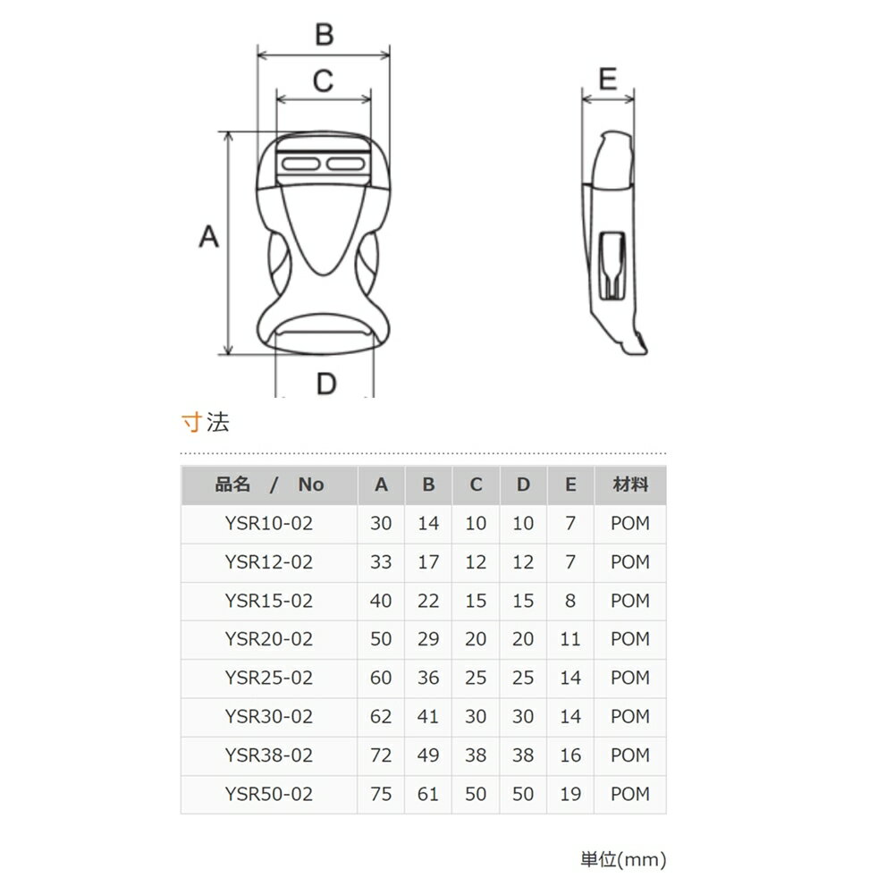 ■用途/特長 メーカー:ニフコ(NIFCO) 品番:YSR 材質:ポリアセタール サイズ:10mm/15mm/20mm/25mm/30mm/38mm/50mm サイズ豊富なサイドリリースバックルです。 ボタン部分を広く取ることでグローブをしていても押しやすく、バッグ向け人気製品です。