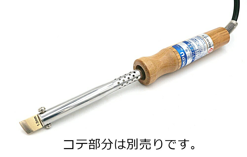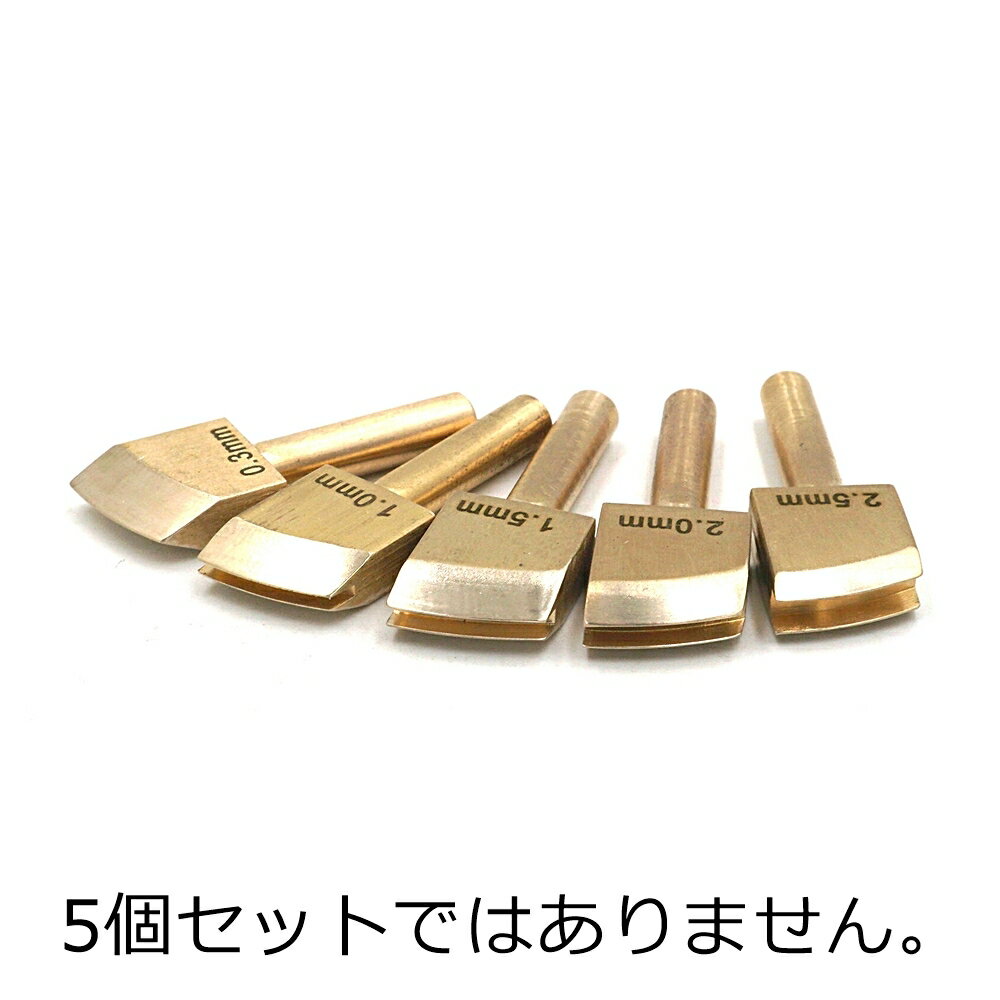 ■用途/特長 交換式の電気捻用の捻先です。 電気で熱処理するので、クローム革にもきれいに線が入ります。 捻引きにより接着部分の強度アップにもつながります。 コテ部分は別売りの電気捻用コテ(はんだゴテ)をご購入ください(HAKKO No.740P 40W)。 その他のはんだコテでは軸径が合いません。 比較的シャープな線が引けます。 真鍮製で柔らかい素材になりますので、ラインを太くするなどの加工も加えやすいかと思います。 軸径:約5mm 捻巾:1重、1.0mm、1.5mm、2.0mm、2.5mm巾の5種類あります。 0.3mm表記のものが1重捻用となります。 中国製ですが、当店で研磨加工を行い、滑らかな使い心地にしております。 研磨がされていないものを購入されますと、革を痛めますのでご注意ください。 使用の際は、必ず別売りのパワーコントローラー(PC-11、PC-31)にセットしてお使いください。 真鍮製で熱伝導率が良いため、温度の高すぎにご注意ください。 【店長コメント】 非常に好評をいただいている捻先です。 1mmは縫い目の外側への捻引きに便利です! 1.5mm、2mmは標準的な巾です。 2.5mmは厚手の革に、1重は主にヘリ返しの内側への捻引きに使用します。 玉捻とは異なりますので、ご注意ください。 【関連商品】・交換式電気捻用コテ(HAKKO No.740P 40W) ・goot グット パワーコントローラー PC-11 ・goot グット ライトコントローラー PC-31 ・太洋電機 goot こて台