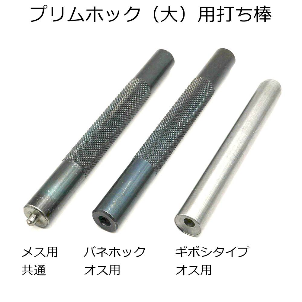 ■用途/特長 プリムホック(大)用の打ち棒です。 オス用(ギボシタイプとバネホックタイプ)とメス用の3種類があります。 プリムホックは通常のバネホック打ちでは打てませんので、こちらの専用打ち具をご使用ください。 大(バネホック径12.5mm)用の打ち具です。 メス用:ギボシタイプ、バネホックタイプ共通 オス用:ギボシタイプ オス用:バネホックタイプ ■使い方 ハトメ抜きで各打具・金具にあった穴を開けておきます。 ハトメ抜きはオス8号(2.4mm)をご使用ください。