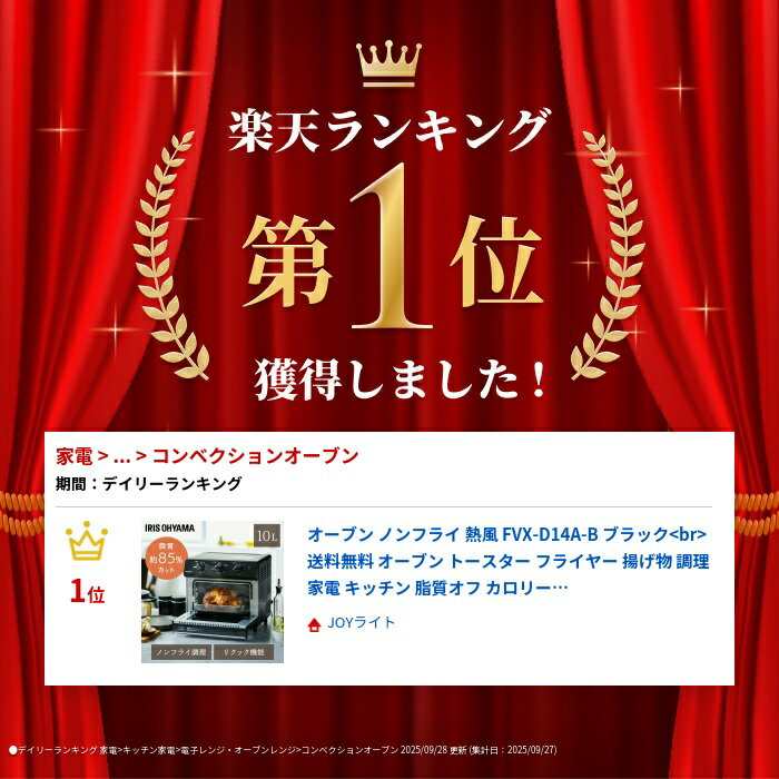 ▼▼▼ 大人気!天井照明ラインナップ ▼▼▼6畳8畳12畳2個セット2個セット2個セット 3個セット3個セット3個セット 6畳 8畳 12畳 2個セット 2個セット 2個セット 3個セット 3個セット 3個セット 【2024年11月19日リニューアルしました】 ●型番 FVX-D3B-S→ FVX-D14A-B ●商品サイズ(cm) 幅約34.1×奥行約32.5×高さ約34.8 →幅約38.3×奥行約38.1×高さ約36 ●庫内有効寸法 リクック/フライヤー:幅約22×奥行約22×高さ約7 オーブン/トースター:幅約25×奥行約25×高さ約8 →幅約28.9×奥行約25.9×高さ約14 ●商品重量 約9.3kg→約7.5kg ●電源コード長さ 約1.2m→約1.0m ●消費電力 1410W→1300W ●ヒーター リクック/フライヤー:シーズヒーター×1 オーブン/トースター:石英管ヒーター×4(上下各2) →シーズヒーター×6(上4下2) ●タイマー 電源スイッチ兼用:30分(ベル音付き) →電源スイッチ兼用 :60分(ベル音付き) ●温度 80〜200度→60〜230度 ●材質 外装:鋼板(紛体塗装)、ガラス、ポリアミド、その他 →鋼板(粉体塗装)、ガラス、PBT樹脂、その他 ●セット内容 焼き網、フライ用網、フライ用受け皿、水皿、水差し、オイルスプレー、レシピブック →焼き網、トレー、バスケット、ハンドル ----------------------------------------- ※アース線は感電から人体を守るためのものです。アース線を必ず接続してください。 アース線をつけずに使用した場合、万一製品が故障したり漏電したりした場合に感電し死亡する恐れがあります。 コンセントにアース端子がない場合は、販売店または電気工事店にご相談ください。 その場合、有償でアース端子を追加する工事が必要になります。 -----------------------------------------大人気ノンフライ熱風オーブンがリニューアル!◆熱と空気でカラッと揚げるノンフライ調理フライヤー機能でカラッとジューシーに。油で揚げないのに美味しくなる秘密は高速熱風調理!庫内の余分な水分を飛ばし、サクッと仕上げます。◆揚げたて食感が楽しめるリクック機能お惣菜や冷凍食品が、いつでも揚げたて食感に。温めなおしにもおススメです。◆大容量で大きな食材も調理可能に従来品(FVX-D3B-S)と比べ約2倍の庫内容量。大きな食材も調理できて便利。◆焼きムラなく、美味しく仕上げるヒーター最大4本使用可能。焼きムラを抑え表裏ともキレイに焼きあがります。◆1台3役(オーブン、トースター、フライヤー)で調理の幅が広がる朝食から夕食まで、これ1台で様々な調理が可能です。●商品サイズ(cm)幅約38.3×奥行約38.1×高さ約36●庫内有効寸法(cm)幅約28.9×奥行約25.9×高さ約14●商品重量約7.5kg(バスケット、ハンドル、トレーは除く)●電源コード長さ約1.0m●電源AC100V、50/60Hz共用●消費電力1300W●ヒーターシーズヒーター×6(上4下2)/使用数(ヒーター切替つまみにより使用するヒーターを切替、最大は4本で1300W)●タイマー電源スイッチ兼用 60分(ベル音付き)●温度60〜230度●材質外装:鋼板(粉体塗装)、ガラス、PBT樹脂、その他内装:メッキ鋼板焼き網・バスケット・ハンドル:鉄線(メッキ)トレー:鋼鈑(ホーロー)●丸洗い可能焼き網、トレー、バスケット●付属品焼き網、トレー、バスケット、ハンドル(検索用:ノンフライ 熱風 オーブン トースター フライヤー 揚げ物 調理 家電 キッチン 脂質オフ カロリーオフ 脂質カット カロリーカット 4967576484411) 最強翌日配送対象商品に関するご案内 最強翌日配送対象商品・対象地域に該当する場合は最強翌日配送マークがご注文カゴ近くに表示されます。 最強翌日配送可能なお支払方法は【クレジットカード、代金引換、全額ポイント支払い】のみとなります。 下記の場合は最強翌日配送対象外となります。 ・15点以上ご購入いただいた場合 ・時間指定がある場合 ・ご注文時備考欄にご記入がある場合 ・決済処理にお時間を頂戴する場合 ・郵便番号や住所に誤りがある場合 ・最強翌日配送対象外の商品とご一緒にご注文いただいた場合 ・お届け先住所文字数が40文字以上の場合 関連キーワード(本商品の説明ではありません)母の日 父の日 敬老の日 こどもの日 クリスマス バレンタイン ホワイトデー ハロウィン お正月 成人の日 成人式 記念日 誕生日 卒業式 入学式 お歳暮 お中元 春 夏 秋 冬 梅雨 節分 ひな祭り 七夕 十五夜 初詣 年越し 夏祭り 花火大会 結婚祝い 内祝い 出産祝い 快気祝い 還暦祝い 古希 喜寿 傘寿 米寿 卒寿 白寿 百寿 新築祝い 引っ越し祝い 開店祝い 開業祝い 就職祝い 昇進祝い 合格祝い 銀婚式 金婚式 七五三 長寿祝い 御礼 お母さん お父さん 義母 義父 祖父 祖母 おばあちゃん おじいちゃん 娘 息子 彼氏 彼女 恋人 友達 上司 先輩 後輩 同僚 キッズ 子供 幼児 ベビー 赤ちゃん 育児 学生 社会人 シニア 10代 20代 30代 40代 50代 60代 70代 80代 90代 一人暮らし 単身赴任 主婦 主夫 新生活 家族暮らし 子育て 旅行 トラベル ライブ ホームパーティ ビジネス 法人 ギフト プレゼントお届け先が沖縄・離島の場合、お届け日時のご希望に沿えない場合がございます。予めご了承ください。 ご注文前のよくある質問についてご確