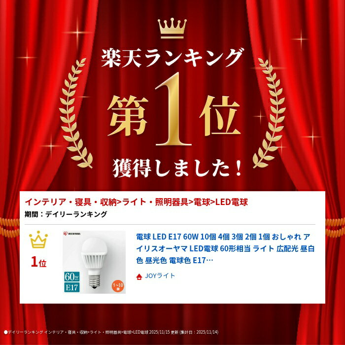 ▼▼▼ 大人気!天井照明ラインナップ ▼▼▼6畳8畳12畳2個セット2個セット2個セット 3個セット3個セット3個セット 6畳 8畳 12畳 2個セット 2個セット 2個セット 3個セット 3個セット 3個セット ランキング 2025年5月19日【祝】ランキング1位を受賞しました階層:楽天市場トップ > ランキングトップ > インテリア・寝具・収納 > ライト・照明器具 > 電球 > LED電球 ※2024年11月13日商品ページリニューアルしました!個数違いを追加しました! ※2024年11月13日商品ページリニューアルしました!個数違いを追加しました! トップランナー制度対応、2017年度省エネ法目標基準値達成のLED電球です。照明器具に合わせやすいスリム形状!白熱電球のように広範囲に明るい広配光タイプで、リビング・ダイニング・キッチン・玄関・階段などの照明に最適。口金サイズがE17口金なので、照明器具を替えることなくご使用いただけます。光色はバランスが取れた明るさで過ごしやすい空間を演出する「昼白色相当」と温かみのある「電球色相当」とより明るくコントラストが強い「昼光色相当」の3種類です。密閉形器具に使用可能。断熱材施工器具には使用できません。(※密閉形器具の種類によって、寸法が合わない、熱がこもる等の要因により、使用できなかったり、寿命が短くなる場合があります。)調光(明るさを調節できる)機能のついた器具には使用できません。誤挿入防止ソケット対応。安心の5年保証付き!長寿命約40000時間でランプ交換の手間も省けます。★LED電球の特長★・水銀レス:環境に有害な水銀を含みません。・すぐに明るく:スイッチを入れた瞬間に明るく点灯します。・虫が集まりにくい:虫が集まりやすい紫外線領域波長をほとんど出さず、灯具清掃の手間を軽減できます。・ON/OFFに強い:スイッチを頻繁にON/OFFしても劣化せず、寿命が短くなりません。・低UV/低赤外線:紫外線や赤外線をほとんど出さないので、紫外線による色あせや赤外線による熱が気になりません。 ●商品サイズ(cm)直径約3.8×高さ約7.4●重量約46g●パッケージサイズ(cm)幅約8.0×奥行約4.0×高さ約8.0※1個・3個セットは1つあたり【幅約4.0×奥行約4.0×高さ約8.0】●口金サイズE17●光色LDA7D-G-E17-6T62P:昼光色相当LDA7N-G-E17-6T62P:昼白色相当LDA7L-G-E17-6T62P:電球色相当●定格消費電力6.5W●定格入力電流0.113A●全光束760lm●エネルギー消費効率116.9lm/W●ランプ全体の明るさ小形電球60W形相当●配光角約220°●定格寿命約40000時間●電源100V(50/60Hz共用)●使用場所屋内用●密閉形器具○●調光機能付器具×●誤挿入防止ソケット○●材質アルミ、ポリカーボネート、ナイロン(検索用:LED電球 電球 LED LEDライト 電球 照明 しょうめい ライト ランプ あかり 明るい 照らす ECO エコ 省エネ 節約 節電 キッチン リビング ダイニング 4967576408134 4967576408141 4967576408158) 最強翌日配送対象商品に関するご案内 最強翌日配送対象商品・対象地域に該当する場合は最強翌日配送マークがご注文カゴ近くに表示されます。 最強翌日配送可能なお支払方法は【クレジットカード、代金引換、全額ポイント支払い】のみとなります。 下記の場合は最強翌日配送対象外となります。 ・15点以上ご購入いただいた場合 ・時間指定がある場合 ・ご注文時備考欄にご記入がある場合 ・決済処理にお時間を頂戴する場合 ・郵便番号や住所に誤りがある場合 ・最強翌日配送対象外の商品とご一緒にご注文いただいた場合 ・お届け先住所文字数が40文字以上の場合お届け先が沖縄・離島の場合、お届け日時のご希望に沿えない場合がございます。予めご了承ください。 ご注文前のよくある質問についてご確認下さい[ FAQ ] ▼ 大人気電球シリーズはこちら ▼ 口金E17タイプ 2〜10個 25W形相当 40W形相当 60W形相当 口金E26タイプ 40W形相当 2個セット 4個セット 10個セット 60W形相当 2個セット 4個セット 10個セット 100W形相当 2個セット 4個セット 10個セット 人感センサー付 40W形相当 60W形相当 \美しい素肌へ/いつものシャワーでスキンケア