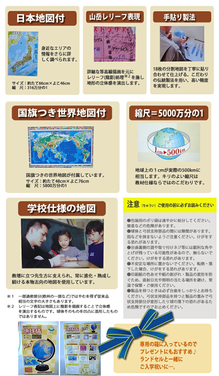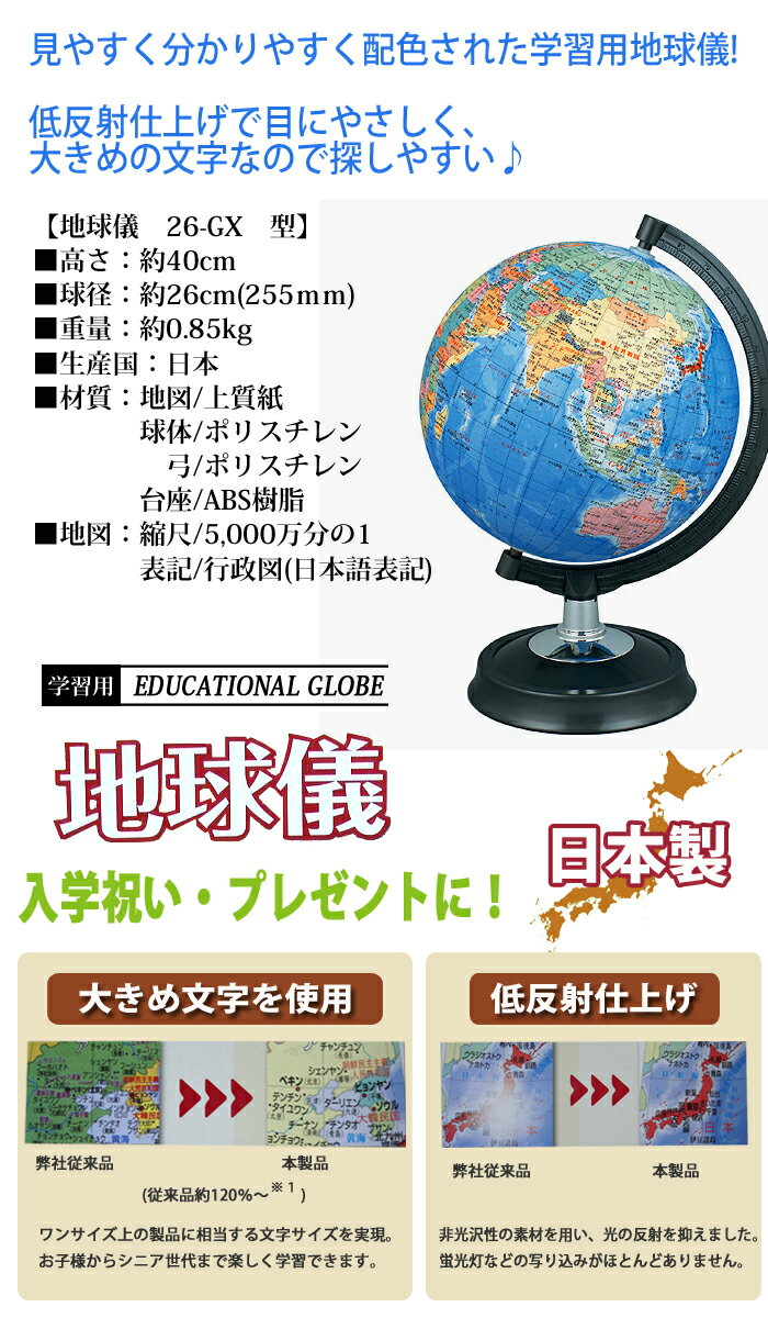 ■ ITEM INFO 大人気!ご自宅での知育教育に。 教材メーカーの国産地球儀。 18枚の船底型の地図を丁寧に貼り合わせて仕上げるこだわりの伝統製法。高密度を実現します。(ハンドメイド製法) 詳細な等高線描写を本にレリーフ(陰影)処理を施した地形の立体感を演出します。 見やすく分かりやすく配色され、低反射仕上げで目にやさしく、大きめの文字なので探しやすい! 学校でも使用されている、行政図タイプ(国や地域別に色分け)を使用した地球儀です。家庭学習用の標準モデル。 球体は、5000万分の1という区切りのよい縮尺を用いて設計されているため、 地球儀上の1cmは、実際の500kmに相当します。 子供も大人も楽しめる見やすい配色の地球儀です。学校の授業だけでなく、インテリアとしてもお使いいただけます。 ※縮尺5000万分の1 行政図、日本語表記 / 日本地図付き・国旗つき世界地図付き 幼稚園の入園祝い、小学校の入学祝いなどにもぴったりです。 【地球儀 26-GX 型】 ■サイズ:高さ約40cm 球径約26cm(255mm) ■重量:約0.85kg ■素材: 地図/上質紙 球/ポリスチレン 弓/ポリスチレン 台座/ABS樹脂 ■地図:縮尺/5,000万分の1 ■ 表記/行政図(日本語表記) ■生産国:日本 ※商品の色は、ご使用のモニターによっては実際の色と異なって見える場合がございます。ご了承ください。 ■商品サイズ・カラーは、企画サイズとなります。 ■商品画像につきましては、モニターの種類・設定等により、実際の商品とは素材感や色味が異なる見え方をする場合があります。 ■細かなキズや、製造上避けられないシミ・シワなどがある場合があります。 ■商品仕様は、予告無く仕様変更される場合がございます。予めご了承下さい。 ●包装用のポリ袋は速やかに処分してください。 窒息などの危険があります。 ●球体と弓状支持部品の間には隙間があります。 指などを挟まないようご注意ください。けがをす る恐れがあります。 ●台座裏側の淵や取り付けネジ等には鋭利な角や とげが残っている可能性があるので、触らないで ください。けがをする恐れがあります。 ●不安定な場所に置かないでください。転倒・落 下した場合、けがをする恐れがあります。 ●印刷紙の色あせや紙の剥がれ・製品の変形を防 ぐため、直射日光や照明の当たる場所を避け、常 温で保管・ご使用ください。 ●製品を持つときは必ず台座をしっかりとお持ち ください。弓状支持部品を持つと製品の重みで弓 状支持部分が変形したり球の落下の恐れがあるため危険ですのでお止めください。