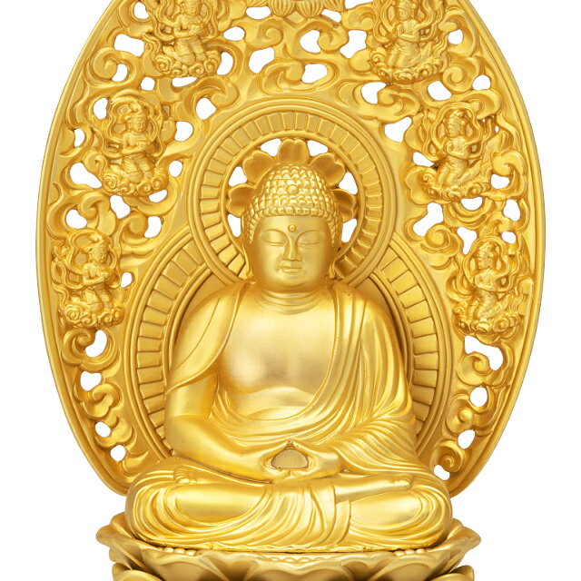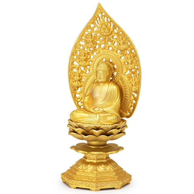 寸法:高さ18cm×巾8cm×奥行6.5cm材質:合金製金メッキ仕上げ生産地:富山県高岡製備考:仏師 牧田秀雲 作釈迦如来は曹洞宗・臨済宗のご本尊です。400年の伝統を誇る銅器の産地「富山県高岡市」で製作された、安定感のある美しい高岡銅器の鋳造仏像です。熟練の職人によって一体一体丹精込めて造られた逸品でございます。商品説明寸法高さ18cm×巾8cm×奥行6.5cm材質合金製金メッキ仕上げ生産地富山県高岡製備考仏師 牧田秀雲 作釈迦如来は曹洞宗・臨済宗のご本尊です。400年の伝統を誇る銅器の産地「富山県高岡市」で製作された、安定感のある美しい高岡銅器の鋳造仏像です。熟練の職人によって一体一体丹精込めて造られた逸品でございます。お寺の中心がご本尊であるように、家庭でもお仏壇の中央にはご本尊を安置します。ご本尊は菩提寺の宗派によってそれぞれ異なりますので、宗派に合わせてお選び下さい。ご本尊寸法は、お仏壇内部の大きさに合わせてお選び下さい。お姿のある仏像か、絵像の掛軸か、どちらかをおまつりしますが意味合いは一緒ですので、お仏壇の造形などに合わせてお選び下さい。◆ 高岡銅器 ◆400年の伝統を誇る高岡銅器は、原型づくり→鋳造→仕上げ加工→着色という細かい工程をたどりつくられます。どの工程においても、熟練した職人が手技の粋を発揮し、それらが連携することにより1つの造形美が生まれます。鋳造工程では、溶けた金属の温度を「目で測る」ほどの長年培った熟練度が要求されます。伝統と気品に満ち溢れた高岡銅器は、ご自宅用はもちろん、贈答品として大変喜ばれています。