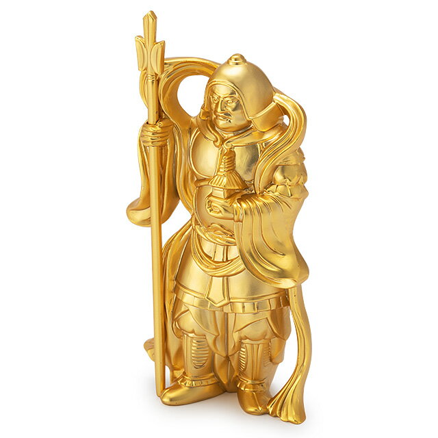 寸法:頭上迄の高さ8.7cm×巾5cm×奥行3cm材質:合金製金メッキ仕上げ重量:約270g生産地:富山県高岡製備考:仏師 牧田秀雲 作400年の伝統を誇る銅器の産地「富山県高岡市」で製作された、安定感のある美しい高岡銅器の鋳造仏像です。熟練の職人によって一体一体丹精込めて造られた逸品でございます。毘沙門天は、四天王のうち、北方を護る多聞天が単独で祀られる時の名前です。毘沙門天は強力な戦勝の神としてあらゆる障害を除去するといわれ、上杉謙信をはじめ多くの武将たちに信仰されてきました。また毘沙門天は、もとはヒンドゥー教の財宝神クベーラで、富や財宝をもたらす財宝の神として七福神の一つに数えられ、広く民間に信仰されています。特に勝負事に利益ありとして崇められています。商品説明寸法頭上迄の高さ8.7cm×巾5cm×奥行3cm材質合金製金メッキ仕上げ重量約270g生産地富山県高岡製備考仏師 牧田秀雲 作400年の伝統を誇る銅器の産地「富山県高岡市」で製作された、安定感のある美しい高岡銅器の鋳造仏像です。熟練の職人によって一体一体丹精込めて造られた逸品でございます。毘沙門天は、四天王のうち、北方を護る多聞天が単独で祀られる時の名前です。毘沙門天は強力な戦勝の神としてあらゆる障害を除去するといわれ、上杉謙信をはじめ多くの武将たちに信仰されてきました。また毘沙門天は、もとはヒンドゥー教の財宝神クベーラで、富や財宝をもたらす財宝の神として七福神の一つに数えられ、広く民間に信仰されています。特に勝負事に利益ありとして崇められています。七福神信仰の歴史は、鎌倉時代に、日本古来の守り神、恵比須(漁労、労働、商売などの守護神)の信仰に、中国を経てインドから大黒天(五穀豊穣、飲食の神)、弁財天(音楽、知恵、弁説、財福の神)の信仰が加わりました。室町時代になり、この三神の信仰が庶民の間に深まってきますと、毘沙門天(人倫の道、仏法の守り神)、布袋(吉凶の占い、家庭円満など福徳の神)、福禄寿(幸運、生活の安定、長寿の神)、寿老人(長寿延命の神)の四神が加えられ、人々の願望に応える七福神として信仰の象徴になったといわれています。江戸時代には、商売繁盛、無病息災、各種大願成就の福徳、福運を求めて、各地で七福神詣でが盛んに行われるようになりました。◆ 高岡銅器 ◆400年の伝統を誇る高岡銅器は、原型づくり→鋳造→仕上げ加工→着色という細かい工程をたどりつくられます。どの工程においても、熟練した職人が手技の粋を発揮し、それらが連携することにより1つの造形美が生まれます。鋳造工程では、溶けた金属の温度を「目で測る」ほどの長年培った熟練度が要求されます。伝統と気品に満ち溢れた高岡銅器は、ご自宅用はもちろん、贈答品として大変喜ばれています。