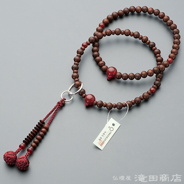 珠の素材:紫檀(艶消) 親珠・四天珠にメノウを使用房の素材:正絹華梵天房(エンジ色)サイズ:六万浄土8寸サイズ宗派:浄土宗・時宗の本式数珠備考:数珠袋付き 数珠は桐箱入り浄土宗・時宗用の正式な女性用の念珠です。紫檀(艶消)の8mm玉を使用し、親珠・四天珠にメノウを使用しました。正絹の華梵天房がついています。大切なお数珠を携帯するのに便利な数珠袋をお付けいたします。数珠は桐箱に入れてお届けします。ご進物・プレゼント用のギフト包装を無料で承ります。お客様に代わり当店スタッフが心を込めて包装させていただきます。「志」、「御祝」、「記念品」などの、のし紙も無料でお付けすることができます。ご希望の方は備考欄にご記入ください。ギフト対応商品説明珠の素材紫檀(艶消)親珠・四天珠にメノウを使用房の素材正絹華梵天房(エンジ色)サイズ六万浄土8寸サイズ宗派浄土宗・時宗の本式数珠備考数珠袋付き数珠は桐箱入り硬く耐久性に優れた紫檀を使用し、アクセントに赤色が美しいメノウを使用した女性用の浄土宗・時宗用本式数珠です。紫檀は赤茶色の美しい木目が特徴ですが、艶を消すことで色に深みが増し、使い込むほどにしっくりと手に馴染んでいきます。華梵天房には高級素材の正絹を使用しております。京念珠製造師が匠の技で仕立てた逸品でございます。【珠の素材】紫檀(艶消)主珠…紫檀(艶消)(8mm)親珠…メノウ(10mm)天珠…メノウ(8mm)【石の力】◆メノウ◆メノウはアゲートとも呼ばれ、古くから豊作の祈願や、健康や長寿のための御守りとして使われてきました。家庭内のトラブルを防いだり、勇気と行動力を養い対人関係よくする力があるとされています。【房の素材】房のデザイン:正絹華梵天房房色:エンジ色◆正絹華梵天房 京都製◆蓮の花をイメージした美しく、しなやかな正絹華梵天房を使用しております。この正絹華梵天房は、軸部分の糸を梵天部分の芯に編み込むことで、軸部分と梵天部分の一体化に成功した丈夫で抜けにくい梵天房でございます。