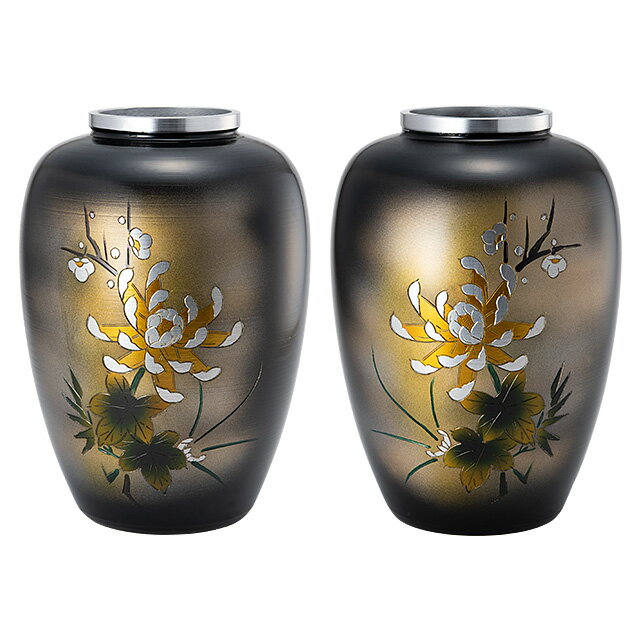 寸法:高さ27.6cm×胴径20cm花瓶口内径:8.8cm材質:アルミ製生産地:富山県高岡製(高岡銅器)備考:一対のセットです(2本一組)。 化粧箱入り全国どこでも送料無料で配送いたします。仏壇や盆棚(精霊棚)、祭壇、仏間などにお花をお供えするときに使う便利な仏壇用花瓶(お盆用花瓶)です。お盆やお彼岸、法事で、美しいお花を活けるのに最適です。初盆・新盆は、たくさんのお花を飾って故人の霊をお迎えします。熟練の職人によって丹精込めて造られる格調高い高岡銅器の花瓶です。アルミ製なので重過ぎず、水の取り換えも楽で使いやすいです。太夏目型は安定感があり、お花もたっぷり活けられます。割れる心配もないので安心・安全です。菊四君子の模様が施された華やかなデザインで、仏壇・仏間を美しく彩る花瓶でございます。美しい花瓶で活けるお花は、豊かな暮らしと安らぎの時間を与えてくれます。商品説明寸法高さ27.6cm×胴径20cm花瓶口内径8.8cm材質アルミ製生産地富山県高岡製(高岡銅器)備考一対のセットです(2本一組)。化粧箱入り全国どこでも送料無料で配送いたします。仏壇や盆棚(精霊棚)、祭壇、仏間などにお花をお供えするときに使う便利な仏壇用花瓶(お盆用花瓶)です。お盆やお彼岸、法事で、美しいお花を活けるのに最適です。初盆・新盆は、たくさんのお花を飾って故人の霊をお迎えします。熟練の職人によって丹精込めて造られる格調高い高岡銅器の花瓶です。アルミ製なので重過ぎず、水の取り換えも楽で使いやすいです。太夏目型は安定感があり、お花もたっぷり活けられます。割れる心配もないので安心・安全です。数多くのタガネを使い分け、優美な模様を創造する彫金技法で、表面に上品な菊四君子の模様が施されています。菊四君子の模様が施された華やかなデザインで、仏壇・仏間を美しく彩る花瓶でございます。美しい花瓶で活けるお花は、豊かな暮らしと安らぎの時間を与えてくれます。◆ 高岡銅器 ◆400年の伝統を誇る高岡銅器は、原型づくり→鋳造→仕上げ加工→着色という細かい工程をたどりつくられます。どの工程においても、熟練した職人が手技の粋を発揮し、それらが連携することにより1つの造形美が生まれます。鋳造工程では、溶けた金属の温度を「目で測る」ほどの長年培った熟練度が要求されます。伝統と気品に満ち溢れた高岡銅器は、ご自宅用はもちろん、贈答品として大変喜ばれています。