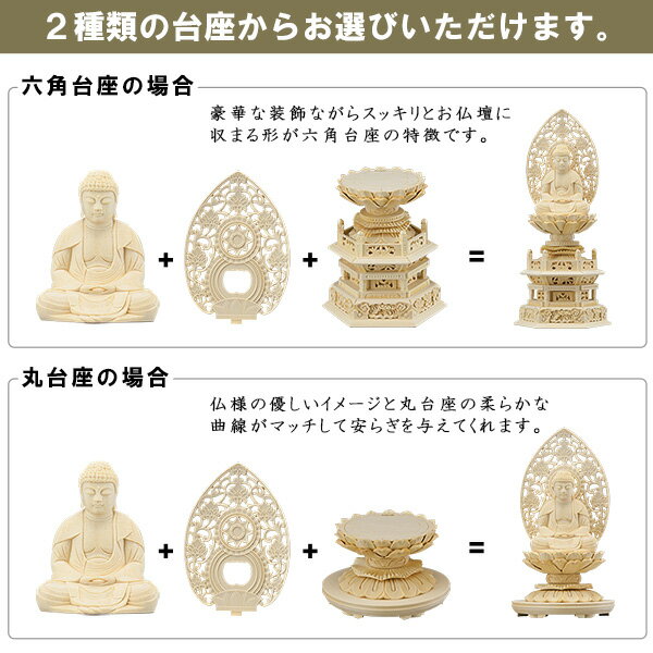 身丈:2寸(6cm)寸法:六角台座−高さ24.7cm×巾11.5cm×奥行8.7cm 丸台座−高さ17.5cm×巾9.2cm×奥行8.7cm材質:白木製(桧材)宗派:曹洞宗・臨済宗・黄檗宗のご本尊釈迦如来は曹洞宗・臨済宗・黄檗宗のご本尊です。お寺の中心がご本尊であるように、家庭でもお仏壇の中央にはご本尊を安置します。ご本尊は菩提寺の宗派によってそれぞれ異なりますので、宗派に合わせてお選び下さい。ご本尊寸法は、お仏壇内部の大きさに合わせてお選び下さい。成田山深川不動堂の一丈八尺の不動明王を手がけた「大仏師 帆刈黌童(ほかりこうどう)」の監修によるお仏像です。美しい光沢と優れた耐久性を持つ白木を使用し、表情にこだわり一体一体丁寧に仕上げております。監修の証として、本体底部には帆刈黌童の朱印が押されております。一木造(いちぼくづくり)で彫り上げられた逸品でございます。【サイズ一覧】身丈1.8寸身丈2.0寸身丈2.5寸身丈3.0寸※ 手彫り仕上げのため、一体一体仕上がりや木目、寸法が多少異なる場合がありますのでご了承願います。※ 手彫り仕上げのため、一体一体仕上がりや木目、寸法が多少異なる場合がありますのでご了承願います。