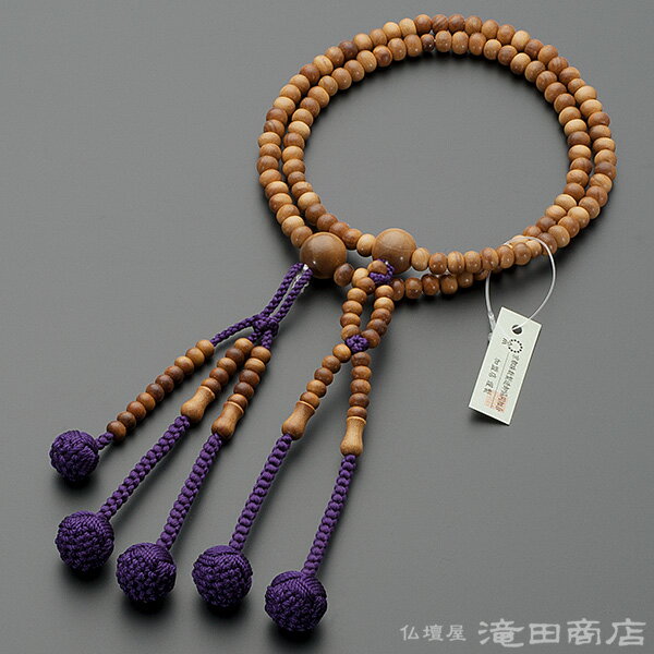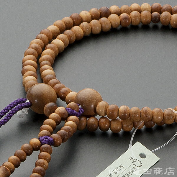 珠の数:主珠108個珠の素材:インド白檀房の素材:正絹華梵天房(紫紺色)サイズ:8寸サイズ宗派:日蓮宗の本式数珠備考:数珠袋付き 数珠は桐箱入り日蓮宗用の正式な女性用の念珠です。インド白檀の6mm玉を使用しました。正絹の華梵天房がついています。大切なお数珠を携帯するのに便利な数珠袋をお付けいたします。数珠は桐箱に入れてお届けします。ご進物・プレゼント用のギフト包装を無料で承ります。お客様に代わり当店スタッフが心を込めて包装させていただきます。「志」、「御祝」、「記念品」などの、のし紙も無料でお付けすることができます。ご希望の方は備考欄にご記入ください。ギフト対応商品説明珠の数主珠108個珠の素材インド白檀房の素材正絹華梵天房(紫紺色)サイズ8寸サイズ宗派日蓮宗の本式数珠備考数珠袋付き数珠は桐箱入りお香の原料やお仏像の素材で多く用いられる白檀の中でも、最上品であるインド白檀を使用した女性用の日蓮宗用本式数珠です。インド白檀は高品質のお香の原料として使用されますので香りも格別で、心を癒してくれる上品な香りを味わって頂くことが出来ます。着色などを一切施していない天然木ですので、使い込むほどに味わい深い艶、色合いになっていきます。華梵天房には高級素材の正絹を使用しております。京念珠製造師が匠の技で仕立てた逸品でございます。【珠の素材】インド白檀 主珠108個主珠…インド白檀(6mm)親珠…インド白檀(13mm)天珠…インド白檀(5mm)【稀少香木】◆インド白檀(びゃくだん)◆白檀は様々な地域で栽培されているのですが、インドのマイソール地方でとれるインド白檀は白檀の中でも最高品質です。インド白檀は「老山白檀」という別称でも呼ばれています。近年、インド白檀は輸出制限をされており、年々値段が高騰しております。今後も高騰が予想される稀少香木でございます。【房の素材】房のデザイン:正絹華梵天房房色:紫紺色◆正絹華梵天房 京都製◆蓮の花をイメージした美しく、しなやかな正絹華梵天房を使用しております。この正絹華梵天房は、軸部分の糸を梵天部分の芯に編み込むことで、軸部分と梵天部分の一体化に成功した丈夫で抜けにくい梵天房でございます。