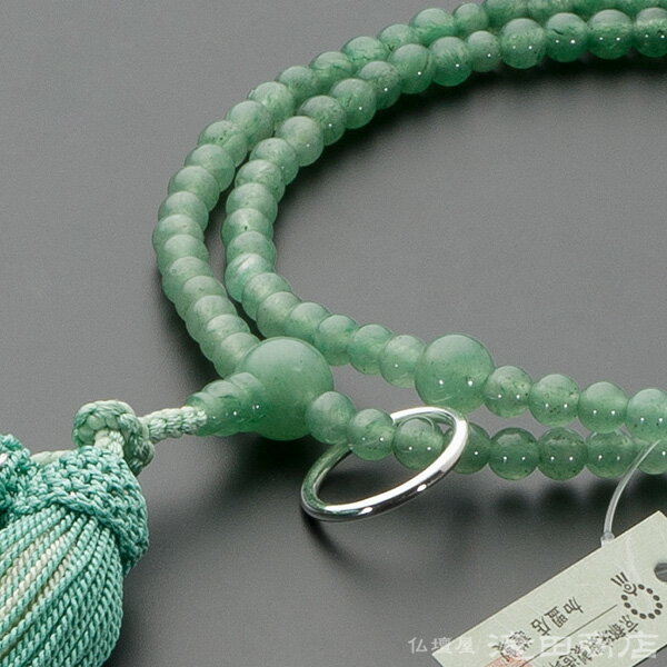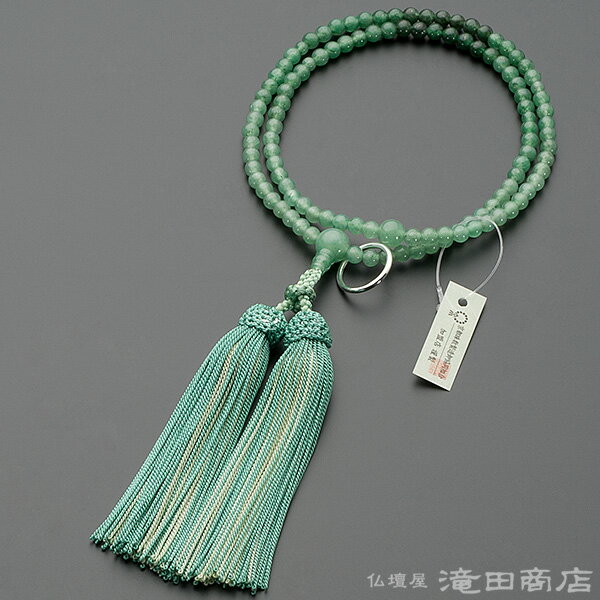 珠の数:主珠108個珠の素材:インド翡翠房の素材:正絹頭付房(青磁色/千草色)サイズ:8寸サイズ宗派:曹洞宗の本式数珠備考:数珠袋付き 数珠は桐箱入り曹洞宗用の正式な女性用の念珠です。インド翡翠の5mm玉を使用しました。正絹の頭付房がついています。大切なお数珠を携帯するのに便利な数珠袋をお付けいたします。数珠は桐箱に入れてお届けします。ご進物・プレゼント用のギフト包装を無料で承ります。お客様に代わり当店スタッフが心を込めて包装させていただきます。「志」、「御祝」、「記念品」などの、のし紙も無料でお付けすることができます。ご希望の方は備考欄にご記入ください。ギフト対応商品説明珠の数主珠108個珠の素材インド翡翠房の素材正絹頭付房(青磁色/千草色)サイズ8寸サイズ宗派曹洞宗の本式数珠備考数珠袋付き数珠は桐箱入り美しいグリーン色のインド翡翠を色の濃淡でグラデーション状に繋いだ女性用の曹洞宗用本式数珠です。あざやかで美しい色合いがお洒落な印象を演出してくれます。色の濃淡でグラデーションにするためには石の選定が非常に難しく、まさに芸術的です。頭付房には高級素材の正絹を使用しており、房色を2色使うことで珠の美しさをより引き立てております。京念珠製造師が匠の技で仕立てた逸品でございます。【珠の素材】インド翡翠 主珠108個主珠…インド翡翠(5mm)親珠…インド翡翠(10mm)天珠…インド翡翠(4mm)【石の力】◆インド翡翠◆インド翡翠はアベンチュリンとも呼ばれ、古くから洞察力を高める石として崇められてきました。精神を安定させ、情緒を豊かにする力があるとされています。【房の素材】房のデザイン:正絹頭付房房色:青磁色/千草色(2色房)◆正絹頭付房 京都製◆京都の伝統工芸である「京房ひも」の職人が製作した正絹頭付房を使用しております。京房ひも職人が作った証しであるシリアルナンバーをお付け致します。※こちらは見本のシリアルナンバーです。シリアルナンバーは商品ごとに違います。