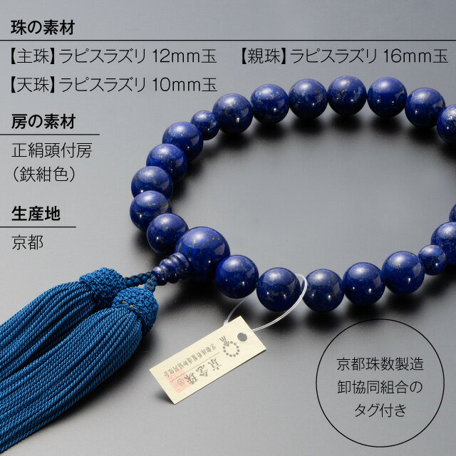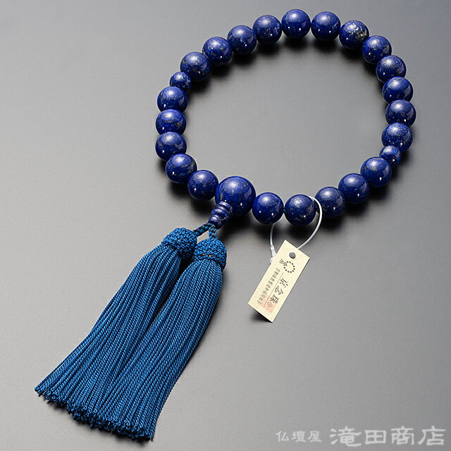 珠の素材:ラピスラズリ 12mm玉 22玉房の素材:正絹頭付房(鉄紺色)備考:数珠袋付き、数珠は桐箱入りすべての宗派でお使いいただける男性用の念珠です。ラピスラズリの12mm玉を使用しました。正絹の頭付房がついています。数珠袋(数珠入れ)をお付け致します。数珠は桐箱に入れてお届けします。ご進物・プレゼント用のギフト包装を無料で承ります。お客様に代わり当店スタッフが心を込めて包装させていただきます。「志」、「御祝」、「記念品」などの、のし紙も無料でお付けすることができます。ご希望の方は備考欄にご記入ください。ギフト対応メーカー希望小売価格はメーカーサイトに基づいて掲載しています商品説明珠の素材ラピスラズリ 12mm玉 22玉房の素材正絹頭付房(鉄紺色)備考数珠袋付き、数珠は桐箱入り「聖なる石」といわれる美しい深い青色のラピスラズリを使用した男性用の念珠です。ラピスラズリの和名は「瑠璃(るり)」で、仏教では極楽浄土を飾る七つの宝石「七宝」の一つとして数えられます。古代エジプトでは、神が宿る石としてファラオや司祭のみが身に付けることができる特別な石でした。澄みきった夜空のような深い青色のところどころに見られる金色のパイライトも美しいアクセントになっていて、手元で品格を感じさせてくれます。頭付房には高級素材の正絹を使用しております。京都の数珠職人が匠の技で仕立てた逸品でございます。【珠の素材】ラピスラズリ 22玉主珠…ラピスラズリ(12mm)親珠…ラピスラズリ(16mm)天珠…ラピスラズリ(10mm)【石の力】◆ラピスラズリ◆ラピスラズリはあらゆる幸運を引き寄せるパワーがあるとされ、古代より世界中で「聖なる石」として崇められてきました。高貴な人間が身に付けていた石で、弘法大師やクレオパトラが愛用していたといわれています。9月の誕生石としても有名です。洞察力や決断力を高め、心の邪念を取り去り幸運と成功をもたらす力があるといわれています。【房の素材】房のデザイン:正絹頭付房房色:鉄紺色◆正絹頭付房 京都製◆京都の伝統工芸である「京房ひも」の職人が製作した正絹頭付房を使用しております。京房ひも職人が作った証しであるシリアルナンバーをお付け致します。※こちらは見本のシリアルナンバーです。シリアルナンバーは商品ごとに違います。