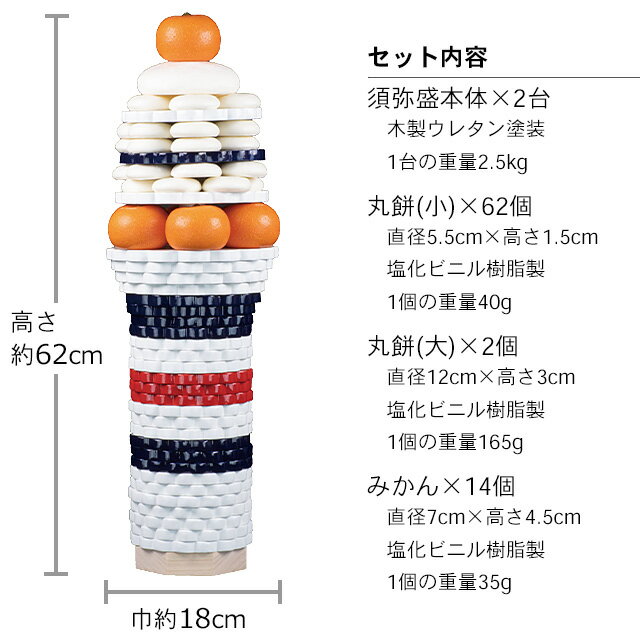 寸法:総高さ約62cm×巾約18cm×下台平径約12.2cmセット内容:・須弥盛本体×2台 木製ウレタン塗装 1台の重量2.5kg ・丸餅(小)×62個 直径5.5cm×高さ1.5cm 塩化ビニル樹脂製 1個の重量40g ・丸餅(大)×2個 直径12cm×高さ3cm 塩化ビニル樹脂製 1個の重量165g ・みかん×14個 直径7cm×高さ4.5cm 塩化ビニル樹脂製 1個の重量35g生産地:中国製(丸餅は日本製)真宗大谷派(東本願寺)で使用する須弥盛です。須弥盛は報恩講などの特別な法要で仏前にお供えします。お餅やみかんもすべて付属しておりますので、届いてすぐにお供えできます。商品説明寸法総高さ約62cm×巾約18cm×下台平径約12.2cmセット内容・須弥盛本体×2台木製ウレタン塗装1台の重量2.5kg・丸餅(小)×62個直径5.5cm×高さ1.5cm塩化ビニル樹脂製1個の重量40g・丸餅(大)×2個直径12cm×高さ3cm塩化ビニル樹脂製1個の重量165g・みかん×14個直径7cm×高さ4.5cm塩化ビニル樹脂製1個の重量35g生産地中国製(丸餅は日本製)真宗大谷派(東本願寺)で使用する須弥盛です。須弥盛は報恩講などの特別な法要で仏前にお供えします。お餅やみかんもすべて付属しておりますので、届いてすぐにお供えできます。