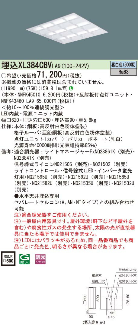 [商品について]※本商品は、メーカー取り寄せのため、欠品している場合がございます。※画像はイメージです。商品の詳細はメーカー受付窓口/HPにてご確認ください。※掲載商品は予告無く販売終了となっている場合もあり、掲載商品全ての出荷確約をするものではありません。[返品・交換について]返品不可:返品不可の商品⇒詳細はこちらをクリック※当店ではお客様都合による交換は受け付けておりません。■メーカー/品番パナソニック XL384CBVLA9■商品カテゴリ照明器具 施設用照明器具 ベースライト LED■取付方法取付・電気工事が必要です。■本体サイズ幅□620・埋込穴□600・埋込高90・重5.8kg■商品説明サイズ区分: 600角ランプ色: LED(昼白色)合計W数: 75ランプ・W数: LED主な仕様: パナソニック 一体型LEDベースライト電圧:100-242VLED内蔵色温度:5000K消費電力:75W(固有)エネルギー消費効率:159.8lm/WRa:Ra83■検索コード 20160516■ジャンル インテリア・寝具・収納 ライト・照明器具 天井照明 キッチンライト・ベースライト■カテゴリ 照明器具 施設用照明器具 ベースライト LEDパナソニック 埋込スクエアベースライトXL384CBVLA9