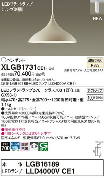 XLGB1731CE1 パナソニック レール用ペンダントライト ベージュ LED(温白色) 拡散