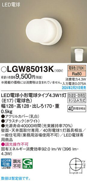 [商品について]※本商品は、メーカー取り寄せのため、欠品している場合がございます。※画像はイメージです。商品の詳細はメーカー受付窓口/HPにてご確認ください。※掲載商品は予告無く販売終了となっている場合もあり、掲載商品全ての出荷確約をするものではありません。[返品・交換について]返品不可:返品不可の商品⇒詳細はこちらをクリック※当店ではお客様都合による交換は受け付けておりません。■メーカー/品番パナソニック LGW85013K■商品カテゴリ照明器具 浴室灯 LED■取付方法取付・電気工事が必要です。■本体サイズ幅128・高128・出しろ170 0.5kg■商品説明カラー区分: ホワイトランプ色: LED(電球色)合計W数: 4.3ランプ・W数: LED電球小形電球タイプ4.3W1灯(E17)主な仕様: パナソニック 防雨・防湿型 白熱電球40形1灯器具相当電圧:100VVA:7.5KVA:0.0075消費電力:4.3W(固有)エネルギー消費効率:92lm/W色温度:2700KRa:Ra80■検索コード 20240229■ジャンル インテリア・寝具・収納 ライト・照明器具 天井照明 浴室照明■カテゴリ 照明器具 浴室灯 LED