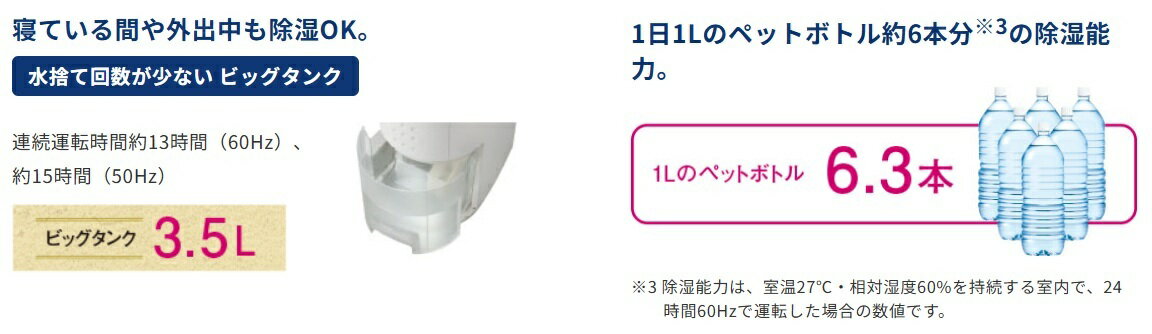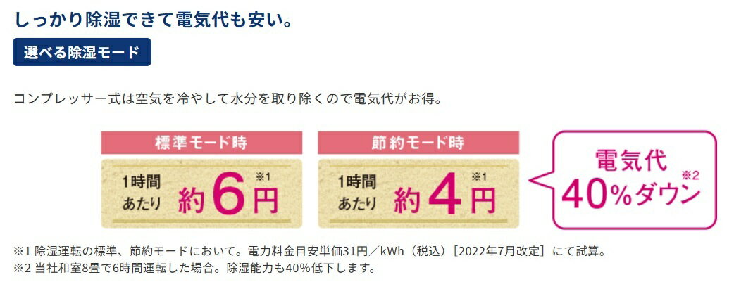 スペック情報 タイプ衣類乾燥除湿機除湿方式 コンプレッサー式タンク容量3.5 L除湿能力木造:7/8畳(50/60Hz) 鉄筋:14/16畳(50/60Hz)1日あたりの除湿能力 5.6 L消費電力除湿時:160W 衣類乾燥時:160W運転音衣類乾燥時:38/36dB(50Hz/60Hz)電源コード長さ1.8 m日本製○空気清浄 ○内部乾燥○衣類乾燥 ○スポット乾燥 ○送風上方向・水平方向:110°衣類乾燥時間約173分自動停止機能 ○タイマー切タイマー(2・4・8時間)幅x高さx奥行き220x515x330 mm重さ7.9 kg※上記スペック情報は正確であることをお約束するものではございません。正確な商品情報につきましては、メーカーの公式サイトをご参照いただくか、直接メーカーへお問い合わせください。※空白部分は未調査の項目です。※掲載情報に誤りを発見した場合は、当ショップまでご連絡ください。ご配送のスケジュールこちらの商品は、 最短出荷商品 です 延長保証のご案内 5年延長保証(自然故障) 1,500円 5年延長保証(自然故障+物損) 2,130円 延長保証は有償のオプションサービスです。 ご加入をご検討のお客様は必ずこちらのページをご確認ください。 ※商品価格が変動して延長保証料が変わる可能性がございますのでご注意ください。