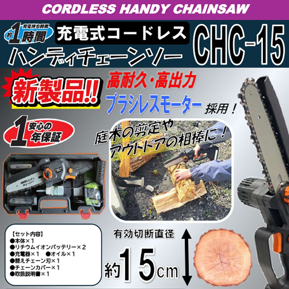 コードレス ハンディチェーンソー CHC-15 シンセイ 充電式 チェーンソー 小型 電動 チェーンソー コードレス チェーンソー コンパクト チェーンソー DIY