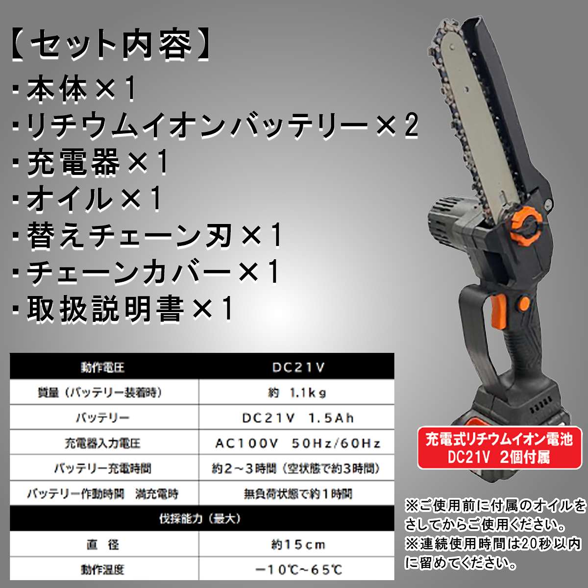 充電持ち時間:約1時間高耐久・高出力のブラシレスモーター採用庭木の剪定やアウトドアの相棒に伐採能力(最大)直径:約15cm動作温度:-10度〜65度セット内容・本体・リチウムイオンバッテリー×2個・充電器・オイル・替えチェーン刃・チェーンカバー・取扱説明書動作電圧:DC21V質量:約1.1kgバッテリー:DC21V 1.5Ah充電器入力電圧:AC100V 50Hz/60Hzバッテリー充電時間:約2〜3時間(空状態で約3時間)バッテリー作動時間 満充電時:無負荷状態で約1時間※樹木の種類によっては有効切断直径は異なります。※ご使用前に付属のオイルをさしてからご使用ください。※連続使用時間は20秒以内に留めてください。検索ワード:シンセイ チェーンソー 小型 チェーンソー 電動 家庭用 チェーンソー 剪定 チェーンソー 枝切り チェーンソー 庭木 チェーンソー 果樹 チェーンソー DIY 工具 電動