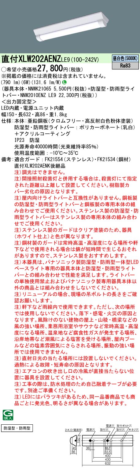 【法人様限定】パナソニック XLW202AENZ LE9 LEDベースライト 直付型 20形 防湿型・防雨型 富士型 FL20形1灯相当 昼白色【NNWK21065 + NNW2010ENZ LE9】