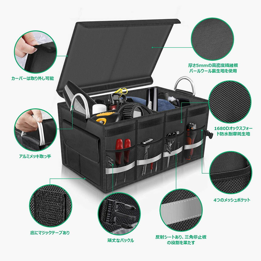 【高品質生地】1680Dオックスフォード防水素材を採用、撥水性・耐久性・耐摩耗性抜群、傷に強い、洗浄しやすい。5mm繊維板で支えている、3kgにも及ぶ重さはその丈夫さを物語っている、たくさん荷物を入れても型崩れしない!【仕切り付き・折り畳み式】超大容量、仕切り2枚が付属、需要に応じ収納スペースをカスタマイズできる、半分畳んで半分だけを使うのも可能。寸法:58*40*30cm;折り畳み後:6*40*30cm【滑り止め、反射シール】底部にマジックテープ式滑り止めがあり、運転中勝手な移動を防ぐ。反射ステッカー付き,緊急停車時三角停止板の代わりに使用できる、後続車に危険を知らせて追突を予防する【アルミめっき取っ手】改良後のアルミめっき取っ手は3重精密な縫製をして、荷重50KGのテストは20時間を経ち、変形なし!重い荷物を持ち運ぶ時手に優しい、より握り心地がいい。【多用途・使用便利】:本収納ボックスは車内で使用するだけではなく、家庭用、アウトドアやピクニックの時に食品の収納などもご利用を頂きます。両側に取っ手が付いていますので、荷物を収納したまま持ち運び可能で、非常に便利です。収納ボックスの要件は何ですか?大容量、高品質、複数のコンパートメント、折りたたみ式、持ち運びに便利?これらすべての要件は、ストレージボックスによって満たされます【収納空間カスタマイズ可能】仕切り2枚が付属され、ボックス内のマジックテープと接着して固定すれば収納スペースを分割できる。【アルミめっき取っ手】アルミめっき取っ手採用、重い荷物を持ち運ぶ時手に優しい、より握り心地がいい。【折り畳める】半分畳んで半分だけ使うのも可能です、トランク空間を無駄にしない、強度と柔軟性を兼ねる。【4メッシュバッグ】側面に4つのメッシュバッグがあり、小さな物を置くのに使用できます,オブジェクトを配置および取得することは非常に便利です【反射シール】緊急停車時三角停止板の代わりになり、後続車に危険を知らせる。【滑り止め】底部にマジックテープ式滑り止めがあり、運転中勝手な移動を防ぐ。【畳んでコンパクト】折り畳み式で使用しない時は折りたんで収納。表面、裏面にも防水加工が施されているので、底面は汚れたらタオルで拭き取る簡単に掃除出来ます。製品仕様材質:1680Dオックスフォード素材仕切り・カバー材質:繊維板、パールウール寸法(展開):58*40*30cm寸法(折り畳み):6*40*30cm重量:2500g※発送方法について:お届け先、個数によって配送情報に記載の配送業者とは異なる場合がございます。日本郵便、または佐川急便(配送方法はご指定頂けません)でお届けいたします。
