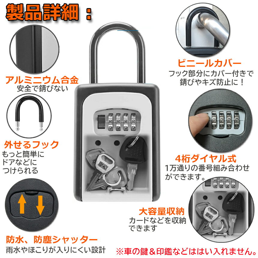 【大容量】大容量の収納スペース(収納スペースは4.5×6.4×3.2cm)で、キー、クレジットカードなどを安全に保管することができ、仕事に行く時や休暇を取る時は、その中に入れることができます。【高品質】キーボックスはアルミニウム合金で作られていますので、耐衝撃性が高いです。そして、耐腐食性と耐候性があり、凍結や割れ、錆などの問題がないです。耐久性がアップします。安定性など良好な性質を備えています。【鍵の管理、共有対策】鍵を忘れて、自宅に帰れなかったり、または他人と鍵や物品などを共有したかったりする時に役に立つ新商品ー鍵ボックスです。鍵を入れて、必要なところに設置します。暗証番号を入力すれば、鍵を取り出して即座に使えます。職場や家庭、会社等の場所で鍵や物品の保管・受け渡しがとても便利になります。【セキュリティ性が高い】4段式ダイヤルなので、10000通りの設定番号から好きな組み合わせを選べます。4桁ダイヤル式設計は3桁より10倍高いの安全性を確保します。4桁の組み合わせは覚えやすく、リセットするのが簡単です。キーなどは紛失して開けられなくなる心配がありません。本体内部に収納できるため、外側から収納物が見えなく、屋外に取り付けても安心してご使用いただけます。【フックが外せるもっと簡単に取り付け】キーボックス上部のU型吊り輪は完全に取り外して分離できる設計を採用します。吊り輪を取っ手、自転車などに掛けて、簡単に固定できます。また、ネジ止めで本体を壁に取り付けることができます。取り付けの専用道具を贈呈していますので、自力で簡単に取り付けられます。【使い道が広い】キーボックスは多く分野で使用できます。ネジ付きで、キーボックスを壁に固定できます。ビス、ナットがあるから,穴があるキャビネットにも適用します、鍵一本しかないけど、複数の人でも共有に利用できます。不動産管理に・アウトドアに・学校、企業、各種介護の現場等の使用に役立ちます。製品仕様:材質:アルミニウム合金外部サイズ:185x85x38mm収納スペースサイズ:約45x64x32mm重さ:約530g最初のパスワード:0000付属品:キーボックスx1ネジパーツx4説明書x1トラブル対応実例パスワード設定をしたくていじっていたら、鍵がしまってしまってあけられなくなってしまいました。こちらの商品は海外輸入商品で、セキュリティ観点から、つくりには一旦ロックしたら、パスワード以外、開けられないようになっております。開ける方法は1つしかなくて、心当たりの数字(設定しようとした数字、もしくはいじった数字)を何度も何度も合わせてみるしかないです。実もの写真通り、日常生活レベルの鍵は1〜5枚までご利用可能、厚みによって入れれる枚数が変わります。ご不明な点等ございましたら必ず直接店舗に確認していただいた上でご購入ください。発送済みの商品に関して、サイズの原因で返品返金は一切受け付けませんので、ご了承の上でご検討ください。大量ご注文いただく場合、条件つきでサンプル無料でご提供いたしますので、直接お問い合わせください。 ※発送方法について:お届け先、個数によって配送情報に記載の配送業者とは異なる場合がございます。日本郵便、または佐川急便(配送方法はご指定頂けません)でお届けいたします。