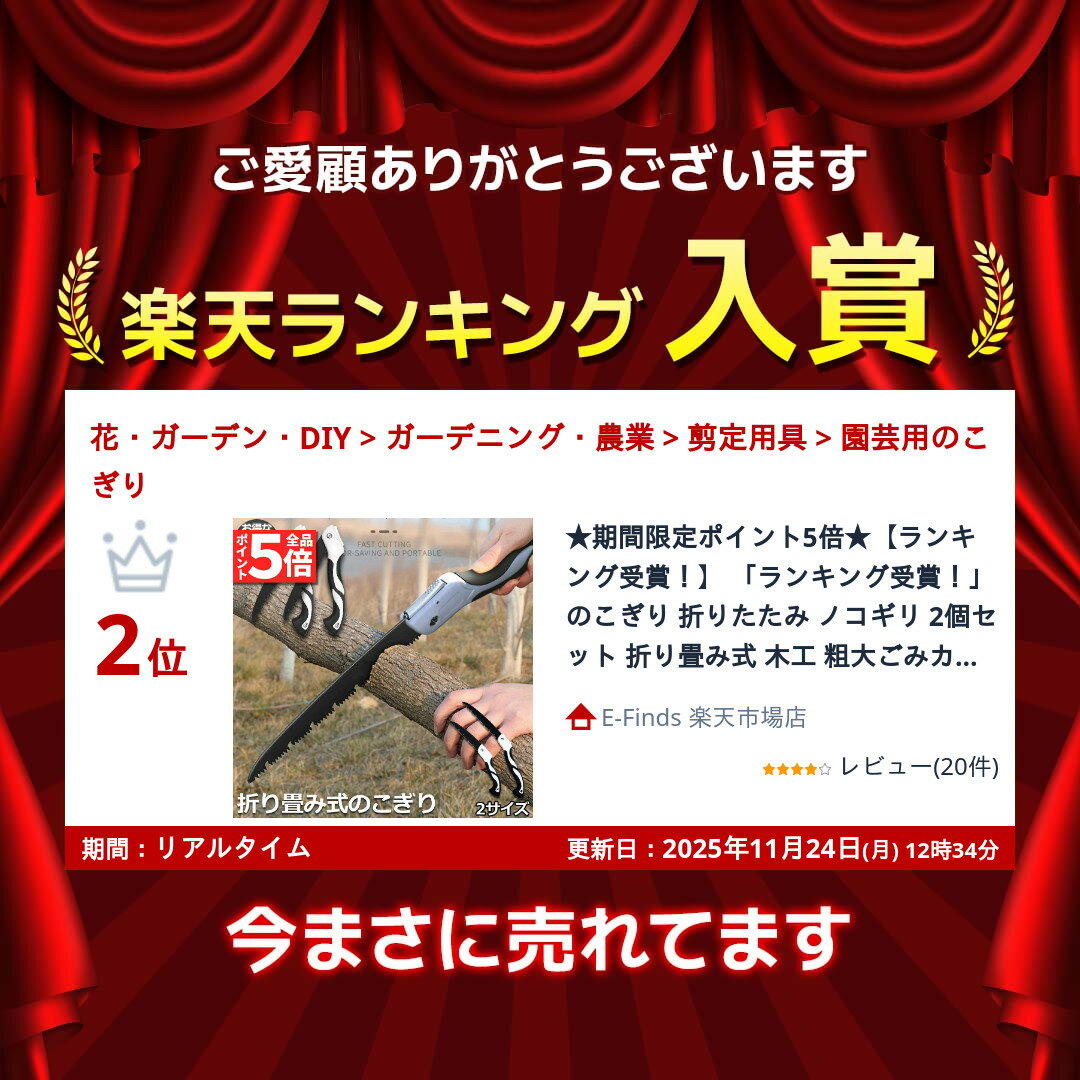 【三面歯設計】効果よく切断できると共に手に快適に設計されています。三面歯設計で太い枝を簡単に切ることができます!生木の切断用&仮枠作業から庭木の剪定まで活躍します。【2サイズ選べる】2サイズご用意いたしました。Mサイズ:長さ540mm(折りたたみ後300mm)/Sサイズ:長さ395mm(折りたたみ後220mm)【滑り止めハンドル】人間工学に基づいた滑り止めハンドルは手に自然にフィットし、緩く握ったときに落下しないように設計されています。SK5鋼素材の頑丈な鋸歯は、強く引っ張っても安定した状態を保ち、正確な切断を実現します。【安全ロック付き】安全ロックを押すとの鋸歯がすばやくに収納可能。収納後刃はハンドルに完全にフィットするため、閉じたときに歯が露出することはありません。持ち運び中の安全性が非常に高くなります。仕様:材質:SK5合金鋼重量:300g刃の厚さ:1mm歯のピッチ:5mm全長:Mサイズ:540mm/Sサイズ:395mハンドルの長さ:Mサイズ:300mm/Sサイズ:220m/鋸歯長さ:Mサイズ:250mm/Sサイズ:180m/ ※発送方法について:お届け先、個数によって配送情報に記載の配送業者とは異なる場合がございます。日本郵便、または佐川急便(配送方法はご指定頂けません)でお届けいたします。