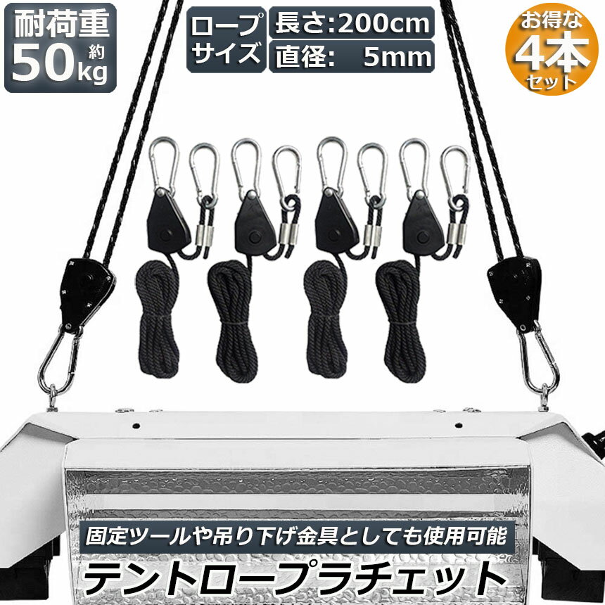 【ランキング受賞!】 ロープラチェット 4本セット ロープハンガー 荷造りベルト フック カラビナ 吊り下げ 荷締機 調整ロープ 2m ハンガー 滑車 便利 タープテント BBQ アウトドア シェード 引越し 運搬 テント ロープ キャンプ バックル