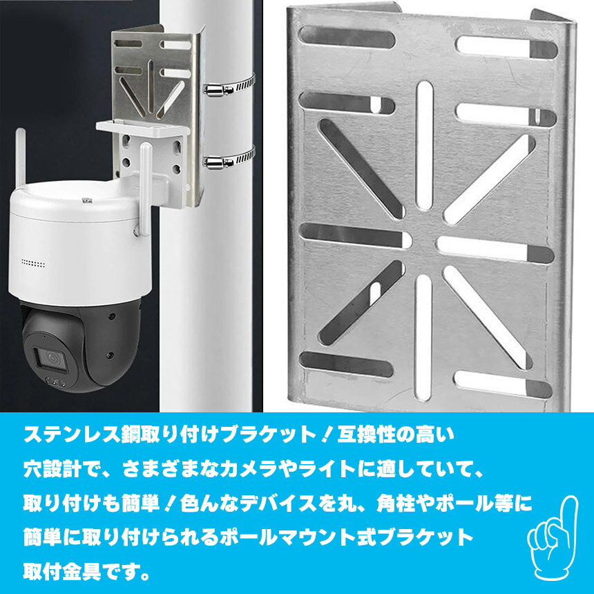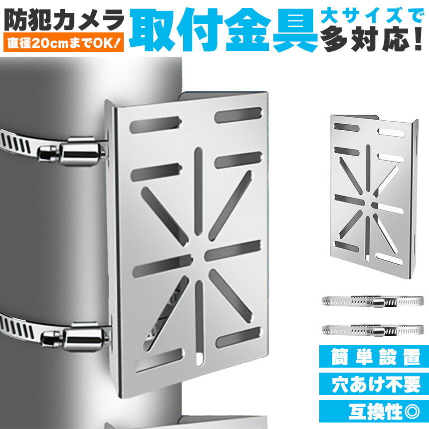 ◎互換性に優れたサイズとネジ穴位置◎防犯カメラハウジングをポールやコンクリート柱などにネジ止めをしないで(構造体に穴をあけずに)、設置するための軽くて丈夫な取付金具(ブラケット)です。ステンレス鋼で頑丈で錆に強くできています。(※取り付けのための器具です。鏡面のようなきれいな加工はされていません。)従来の小さめでは入らなかった、もうちょっと大きめの頑丈なものが欲しいかた、これから取り付けをされる方にお勧めです。穴あけ・ビス止め不要!付属のステンレス製バンドで円柱、角柱の両方にしっかり固定できます。格子状のベランダやフェンスなどへの取り付けにも使用できます。直径約20cmまでのポールへの取付けに対応します。(付属ステンレスバンド使用時)防犯カメラ、ソーラーライト、センサーライトなどカメラ以外も取り付けることができます。・取付金具の販売です。カメラはついてきません。※日本語取扱説明書、撮影用小物類などは付属しておりません。※簡易包装でのお届けとなります。※モニターにより色合いが若干違いが生じる場合がございます。※デザインは入荷時期により若干変化する場合がございます※海外製造品のため、多少の匂い軽微な傷や汚れ、個体差等ある場合がございます。※商品の使用により生じた如何なる損害・被害も弊社では一切の責任を負いかねますので予めご了承ください。※発送方法について:お届け先、個数によって配送情報に記載の配送業者とは異なる場合がございます。日本郵便、佐川急便、またはセイノーエクスプレス(大型商品)でお届けいたします。なお、配送業者はお選びいただけませんので、ご了承ください。