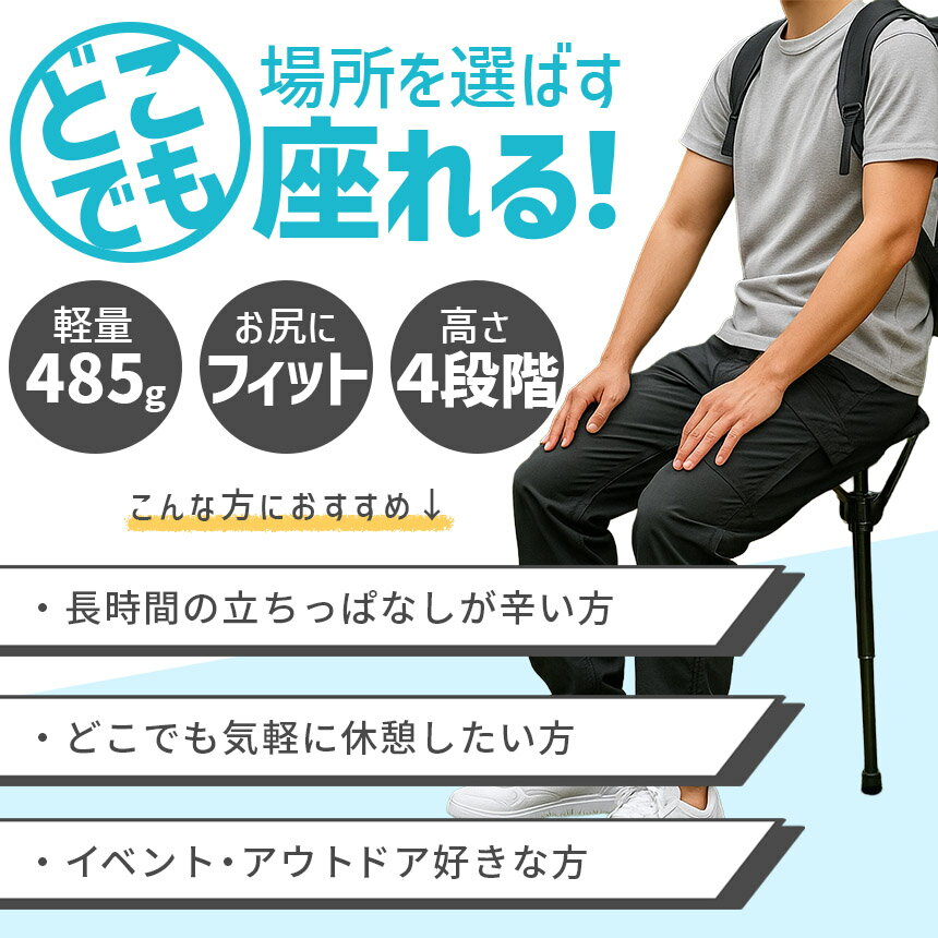 「一脚で、自由に休憩。」アウトドアや旅行、行列待ちなど、どんなシーンでも気軽に使える 一本足折りたたみチェア。わずか約485gとペットボトルより軽く超軽量ながら、最大100kg程度まで耐えられる頑丈設計。コンパクトに収納でき、持ち運びにも便利な実用的アイテムです。◆軽量&コンパクト設計本体重量はわずか485g。折りたたむと細長いスティック状になり、リュックやバッグに入れてもかさばりません。付属のショルダー紐で肩掛けもOK!登山や釣り、フェス、スポーツ観戦など「持ち運びやすさ」を重視する方に最適です。◆高耐久素材で安心座面には強度の高いオックスフォードクロスを使用。フレーム部分は7075アルミニウム合金に加え、TPU・ナイロン素材を組み合わせることで、耐久性と軽量性を両立。アウトドアの過酷な環境でも長く使用できます。◆最大耐荷重120kg見た目はスリムでも、耐荷重120kgのタフ設計。大人の男性でも安心して腰掛けることができ、急な休憩や長時間の待機にも活躍します。(※過度に傾けた状態や、滑りやすい場所は転倒、故障の原因となりますのでお気を付けください。)◆使いやすい折りたたみ構造小さくまとまる折りたたみ式。最初は説明画像のように少し力とコツがいりますが、すぐになじんで開閉しやすくなります。イベントや行列、アウトドアでの短時間休憩にとても便利です。また、高めにして座ると、狭い場所でも腰掛けられ迷惑をかけずに休むことができます。◆4段階高さ調節脚部分のポッチを押しながら上下にスライドさせて調節できます。低くしっかり座ることも、ちょっと足を休めるのに高めにして立ち座りを楽にご使用することもできます。◆多用途で大活躍・登山やキャンプの休憩に・釣りや野外イベント、フェスのお供に・公園や街中での散歩・ウォーキング中の休憩に・スポーツ観戦や写真撮影の待ち時間に・長時間の行列や待機での「ちょっと座りたい」瞬間に◆こんな方におすすめ「荷物を増やさずに、どこでも腰を下ろしたい方」「長時間の立ちっぱなしに不安を感じる方」「軽量&耐久性のある折りたたみチェアを探している方」◆製品についてサイズ:約47x8x7cm(折り畳み時)カラー:ブラック・レッド材 質:アルミニウム合金、ナイロン、TPU※日本語取扱説明書、撮影用小物類などは付属しておりません。※簡易包装でのお届けとなります。※モニターにより色合いが若干違いが生じる場合がございます。※デザインは入荷時期により若干変化する場合がございます※海外製造品のため、多少の匂い軽微な傷や汚れ、個体差等ある場合がございます。※商品の使用により生じた如何なる損害・被害も弊社では一切の責任を負いかねますので予めご了承ください。※発送方法について:お届け先、個数によって配送情報に記載の配送業者とは異なる場合がございます。日本郵便、佐川急便、ヤマト運輸、またはセイノーエクスプレス(大型商品)でお届けいたします。なお、配送業者はお選びいただけませんので、ご了承ください。