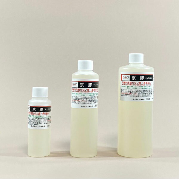 原材料:膠・合成樹脂使用分類:糊剤形状:液状(ゼリー状)容量:250mlサイズ:高173×径49mm【商品説明】魚膠をベースにした糊剤です。乾燥後の塗膜は湿度変化の影響が少なく歪まないため、作品画面に亀裂が生じにくい特徴があります。絵具層の負担が少なく大作や海外搬出等で不安を抱えている膠ユーザーにもお勧めです。液状ですので膠を固形から溶かす手間がありません。膠絵の将来性と普及を考えた商品です。顔料と糊剤を混ぜ合わせた後、水で希釈して描画します。膠同様に気温によってゼリー状になりますので湯煎して液状にしてご使用下さい。ドーサ液としては使用出来ません、別売の中性サイズ剤をお勧めします。【京膠・都膠について】日本で古くから使われている膠。現在、絵画では主に日本画等で使用されている糊剤ですが、古くは西洋でもデトランプと呼ばれた膠絵がありました。膠は人類が糊剤を使用した初期の原始的な材料です。画面に亀裂を起こしやすく、扱いづらいこともあり、絵画での使用は限られてきています。京膠・都膠は、この癖をなくし近代材料として作り変える事で、改めて膠を見直しました。日本のアイデンティティーを探ることで、膠の普及を考えた材料です。
