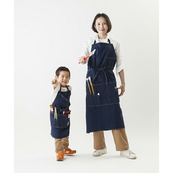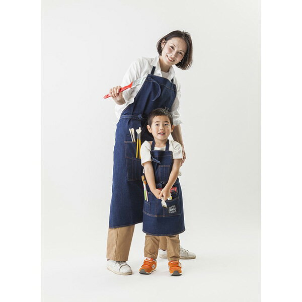 親子で着られるおしゃれなインディゴ染デニム生地を使用したエプロンです。 作品の制作はもちろん、DIYやホビー、お仕事にもおすすめです。 <仕様> サイズ:おとな用/こども用(男女兼用) 素材:綿 99%、ポリウレタン 1% カラー:インディゴブルー 中国製 ※こども用は110cm~140cm用です。 おとな用 こども用 a 胸当て幅 27cm 18cm b 前丈 100cm 54cm c 腰幅 106cm 54cm d 裾幅 85cm 52cm e 腰ひも 87cm 55cm f 腰ひも幅 2cm 2cm サイズが調節しやすい首掛け仕様。 作業に必要な画筆や道具を収納可能なポケット。 おとな用は画筆やペン、カッターなどはもちろん、刷毛や定規なども収納できます。 こども用は鉛筆やクレヨン、短軸画筆などが入ります。 おとな用はメモブックや手帳などさまざまなものを持ち運べます。 こども用はハンカチやティッシュなど、作業の必需品を入れられます。 【ご注意】 この製品はインディゴ染めです。他の製品では味わえない自然な風合いがあり、洗うごとに独特の色落ちの変化を楽しめます。 取り扱いの際は、取扱い絵表示をご確認の上、次の点に十分ご注意ください。 ・着用により、他の衣類等に色が付着することがあります。 ・色移りの可能性があるため、エプロン着用時には淡い色の洋服の着用はお避けください。 ・摩擦により、淡い色のベルトやバッグ等に色移りしますのでご注意ください。 ・色落ちするため、他のものと一緒に洗わないでください。