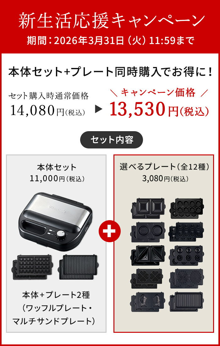 ワッフルメーカー ビタントニオ プレート2枚組 【特典付き】 ホットサンドメーカー 電気 耳まで タイマー レシピ付き ホットサンド ワッフル トースト トースター パニーニ ワッフル&ホットサンドベーカー VWH-500 [ 正規販売店 ]