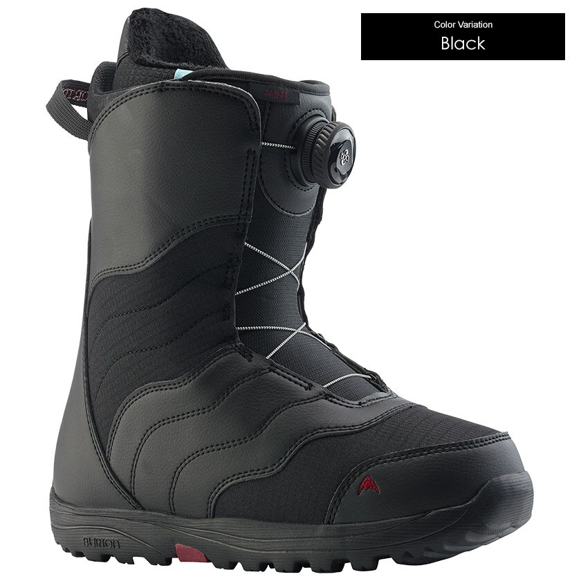 BOARフィットシステム採用ワイドスノーボードブーツ。 BOARフィットシステムの調節機能を備えた、ライトウェイトでソフトフレックスなデザイン。柔らかく足に優しい履き心地で、調整もスムーズ。ウィメンズ Burton ミント BOAR ブーツは、履いたその日から成長をサポートしてくれるブーツです。リラックスしたライディングで、地形に合わせて探索や体験を楽しんで。軽量でレスポンシブなライディングを実現。レースでフィット感と履き心地を微調整してダイヤルを回せば、あなたらしいスタイルが完成。一日中滑りたくなる、しっかりとした保温性能を備えています。・ソフトで遊びやすいやわらかめで扱いやすいフレックスが、あらゆる地形で自由な遊び心とクリエイティブな滑りを引き出します。・フィットの微調節が可能BOARフィットシステムでは、ダイヤルをさっと回すだけでフィットの微調整が可能。・ライトウェイトDynoLITEアウトソールは、ライディング期間中に必要な全てのグリップとクッションを備え、アウトソールは20%軽量化されています。・足幅が広い仕様つま先まわりにゆとりを持たせた設計で、幅広の足にも対応。